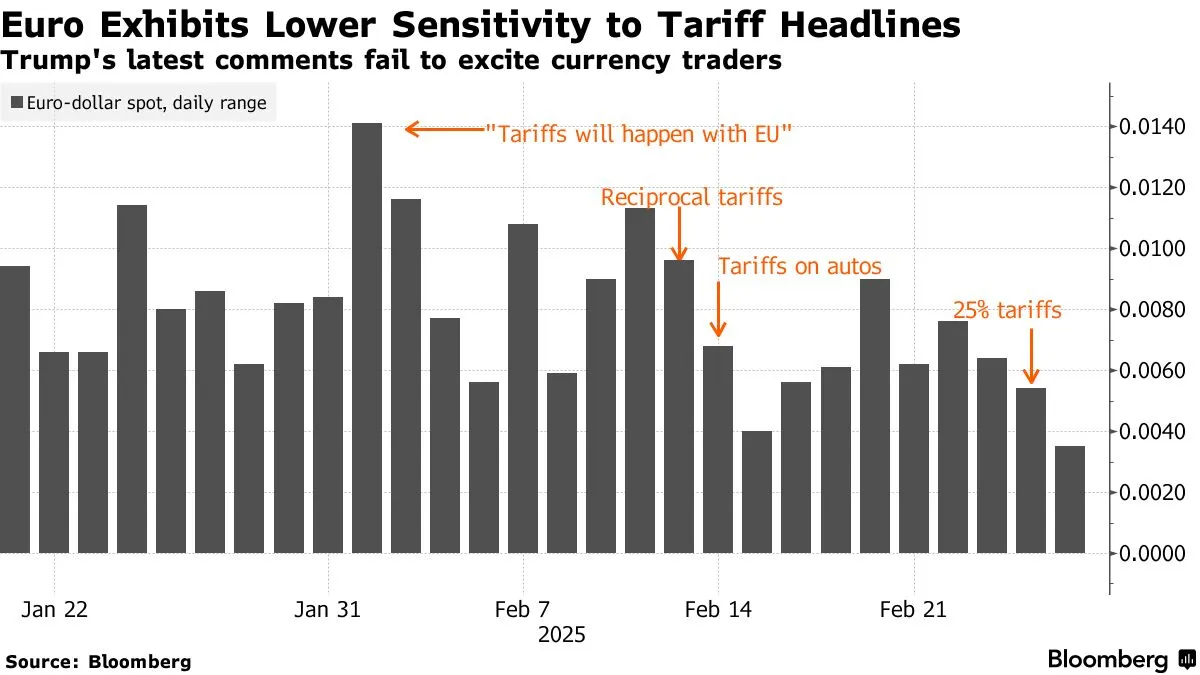 作為市場對關税威脅疲軟的信號,歐元匯率波動範圍收窄至特朗普就職以來最窄水平——儘管他持續威脅將對歐洲實施貿易限制。特朗普關於歐盟產品關税將提高至25%的言論並未撼動歐元匯率。由於交易員在實質性調整頭寸前等待官方公告,歐元對關税相關頭條新聞的敏感度有所降低。