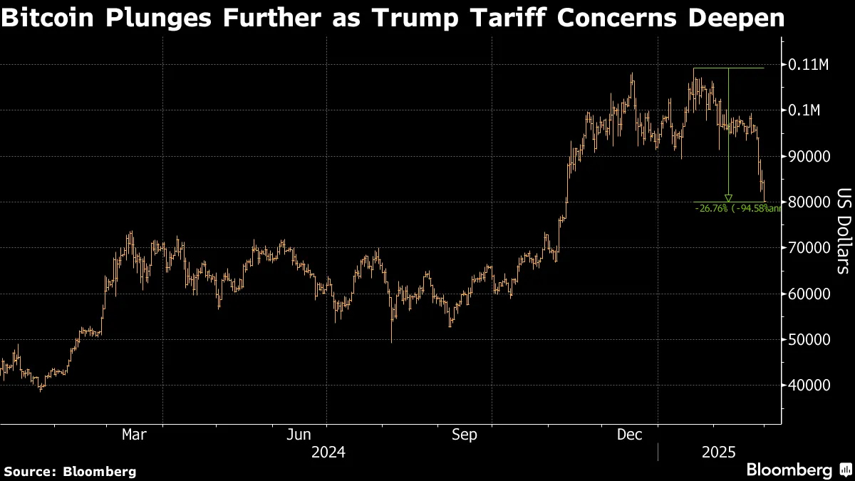 “我們上次看到這種情緒還是在2022年,“BTC Markets首席執行官卡羅琳·鮑勒表示,她指的是在利率上升和行業問題導致價格暴跌的"加密貨幣寒冬”。“這次下跌可以看作是對特朗普關税引發的宏觀擔憂和地緣政治不確定性的反應。”