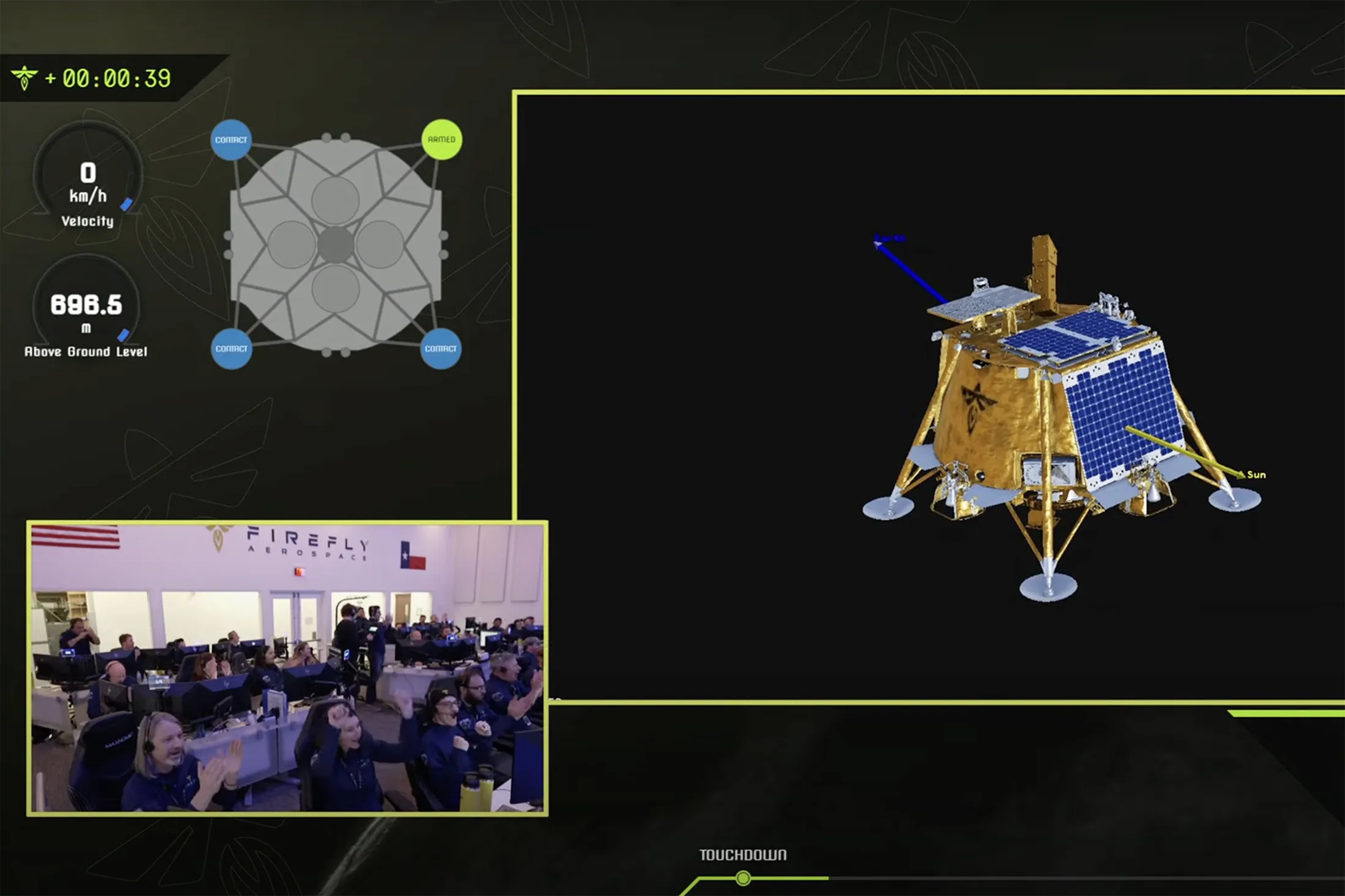 “我們登月成功了,“螢火蟲任務控制中心的一名飛行控制員在着陸後宣佈。在德克薩斯州雪松公園公司總部附近的觀禮派對上,螢火蟲員工和來賓爆發出歡呼聲。