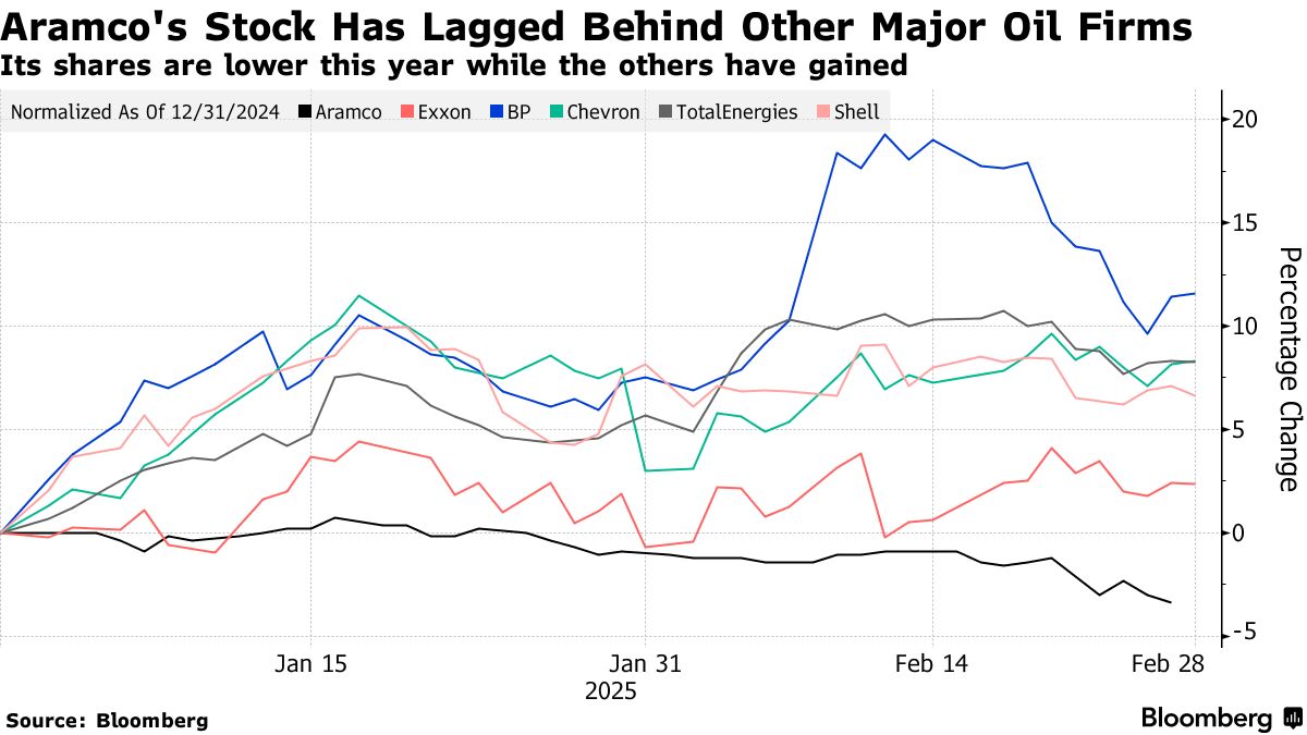 沙特阿美淨利潤已連續七個季度同比下滑,分析師預計第四季度將再次下降。公司股價同樣表現不佳,今年下跌約3%,落後於包括埃克森美孚和殼牌在內的石油巨頭同行。
