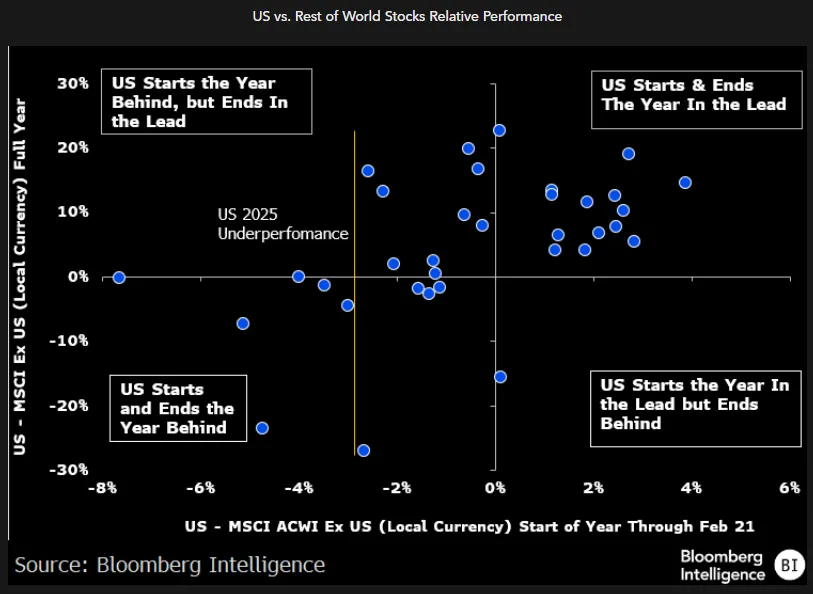 若歷史具有參考性,這可能意味着未來數月將延續美股相對疲軟的態勢。彭博智庫對35年數據的分析顯示,當標普500在2月中旬落後國際基準股指超過2.8個百分點時(如今年情況),該指數從未在全年表現中跑贏全球同行。