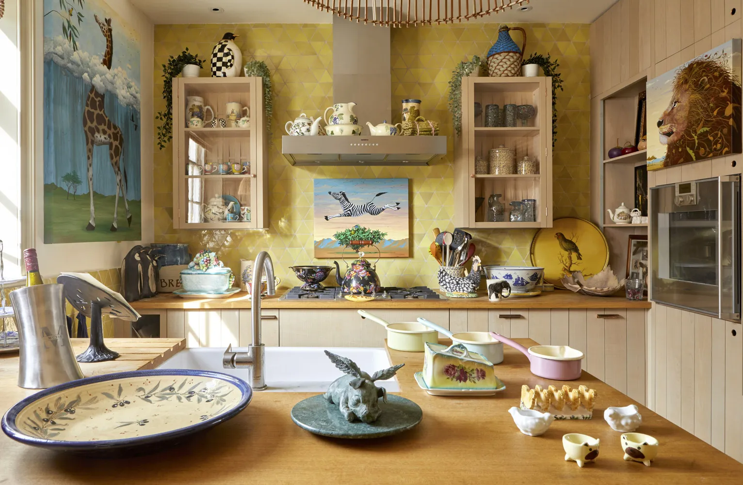 麥克維親自裝飾的廚房。圖片來源:Beauchamp Estates公寓一樓設有會客廳、廚房、餐廳和書房。全屋鋪設淺色橡木拼花地板,這是應麥克維要求安裝的。她還親自改造了廚房,增加了橡木操作枱、暖黃色陶瓷牆磚和早餐吧枱。