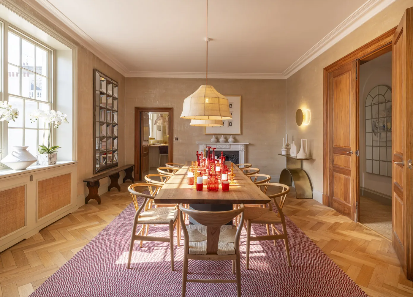 正式餐廳。圖片來源:Beauchamp Estates複式上層是主卧套房,配有獨立梳妝區、更衣區以及帶大型浸泡浴缸和淋浴間的套內浴室。該層另有兩間卧室與浴室。當初讓麥克維決定買下這棟房子的屋頂露台就在上方。