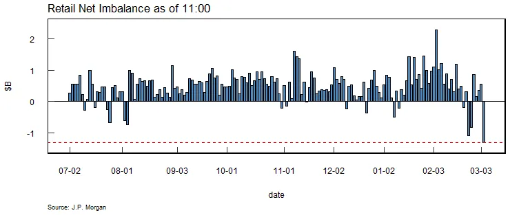 摩根大通全球量化及衍生品策略師Emma Wu表示,在交易首小時,散户投資者從美股市場撤資12億美元——這是該行自十年前開始統計該數據以來,同期最大規模的資金外流。個股撤資金額達11億美元,且資金撤離廣泛分佈於各行業板塊。