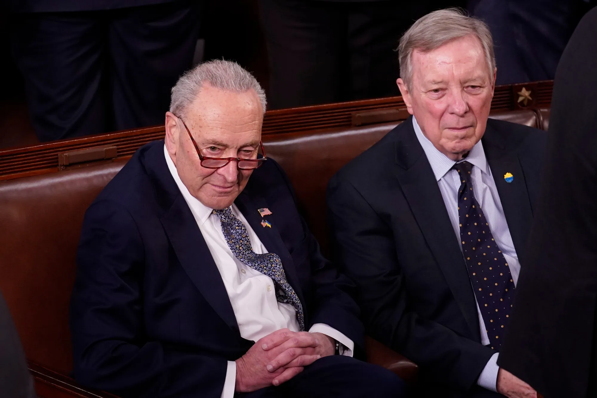 參議院少數黨領袖、紐約州民主黨人查克·舒默(左)和伊利諾伊州民主黨參議員迪克·德賓在週二國會聯席會議上,當時總統唐納德·特朗普呼籲廢除一項支持國內半導體制造投資的520億美元計劃。舒默週三表示,特朗普廢除該法律的努力將失敗。攝影師:阿爾·德拉戈/彭博社楊稱該法律是“我們這個時代最偉大的成就之一”,並表示他在公開和私下都得到了特朗普內閣提名人的保證,在他承諾支持他們的確認之前,他們會執行《芯片法案》。