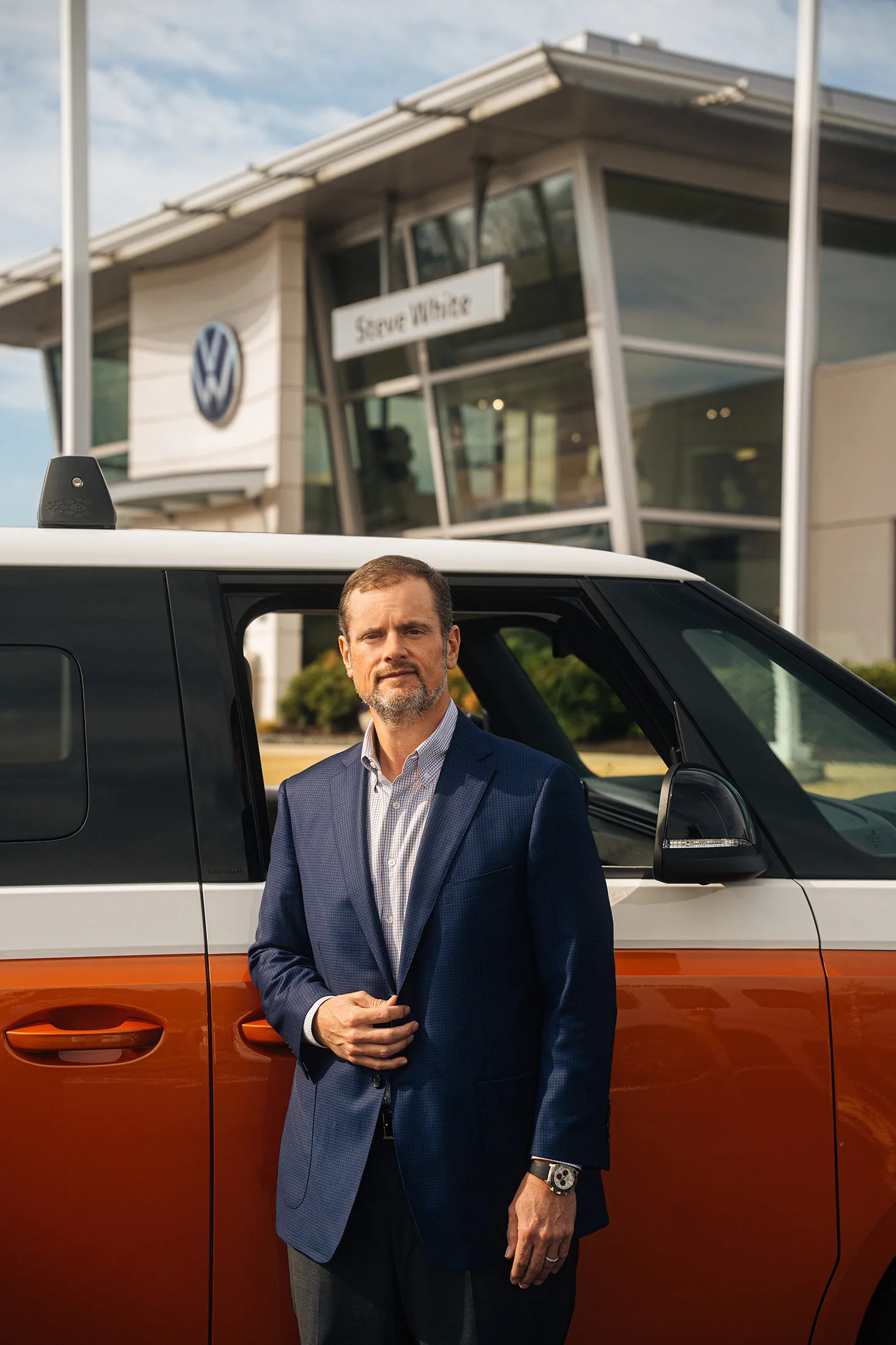 馬克·懷特在他位於格林維爾的經銷店。攝影師:威爾·克魯克斯為《彭博商業週刊》拍攝美國消費者購車的歷史有多久,經銷商模式就存在了多久——他們分銷車輛,讓到店顧客能進行以舊換新、獲得貸款並議價。但這也蠶食了車企利潤,部分製造商迫切希望打破這一模式。最早嘗試直銷模式的是特斯拉等當時的新興電動車企,該公司以自建展廳而非經銷商網絡聞名。如今包括大眾和本田在內的傳統車企,也正通過大眾旗下Scout等新電動車品牌首次試水直銷。