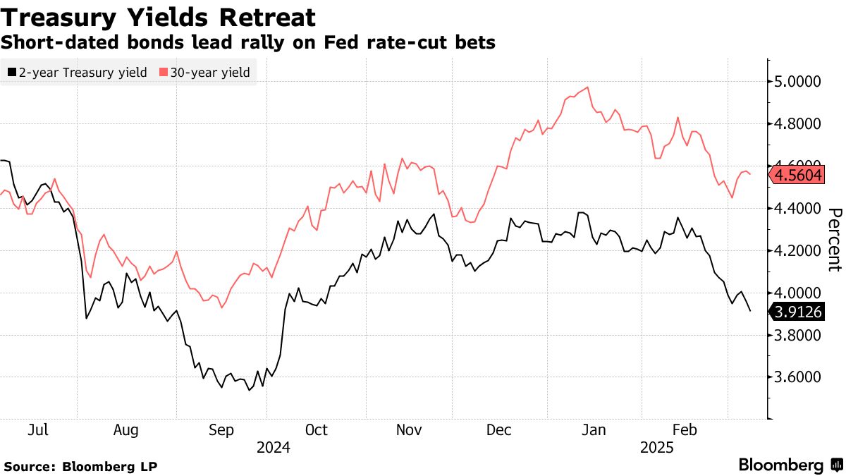 關於特朗普將向經濟擴張注入刺激措施(並維持國債收益率上行壓力)的猜測,在其上任不到兩個月內迅速被推翻。相反,交易員們正大舉買入短期國債,推動兩年期收益率自2月中旬以來大幅下跌,因市場預期美聯儲最早將於6月重啓降息以防止經濟惡化。