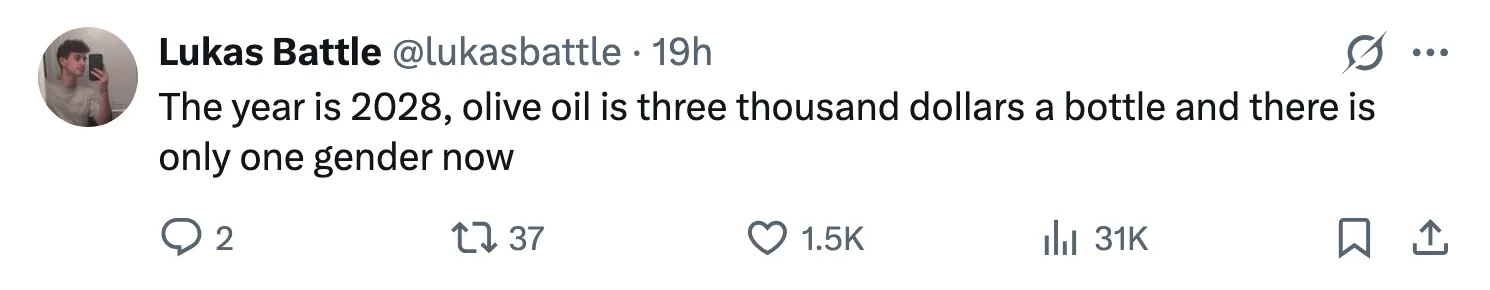 “他們躲過一劫!”是這裏的主流反應。但誰躲過了?你的答案會因個人政治立場而不同。2022年時,文化集體意識會説是新娘。但如今,反覺醒陣營認為避免災難的是新郎。這顯示了特朗普任內文化戰爭逆轉之快。種種跡象 表明 時代精神正轉向保守主義。艾莉森·施拉格稱股東資本主義正在迴歸。斯蒂芬·L·卡特透露喬治城法學院被要求從課程中刪除DEI(多元平等包容)。加文·紐森在播客中坦言認為跨性別運動員“極不公平”。