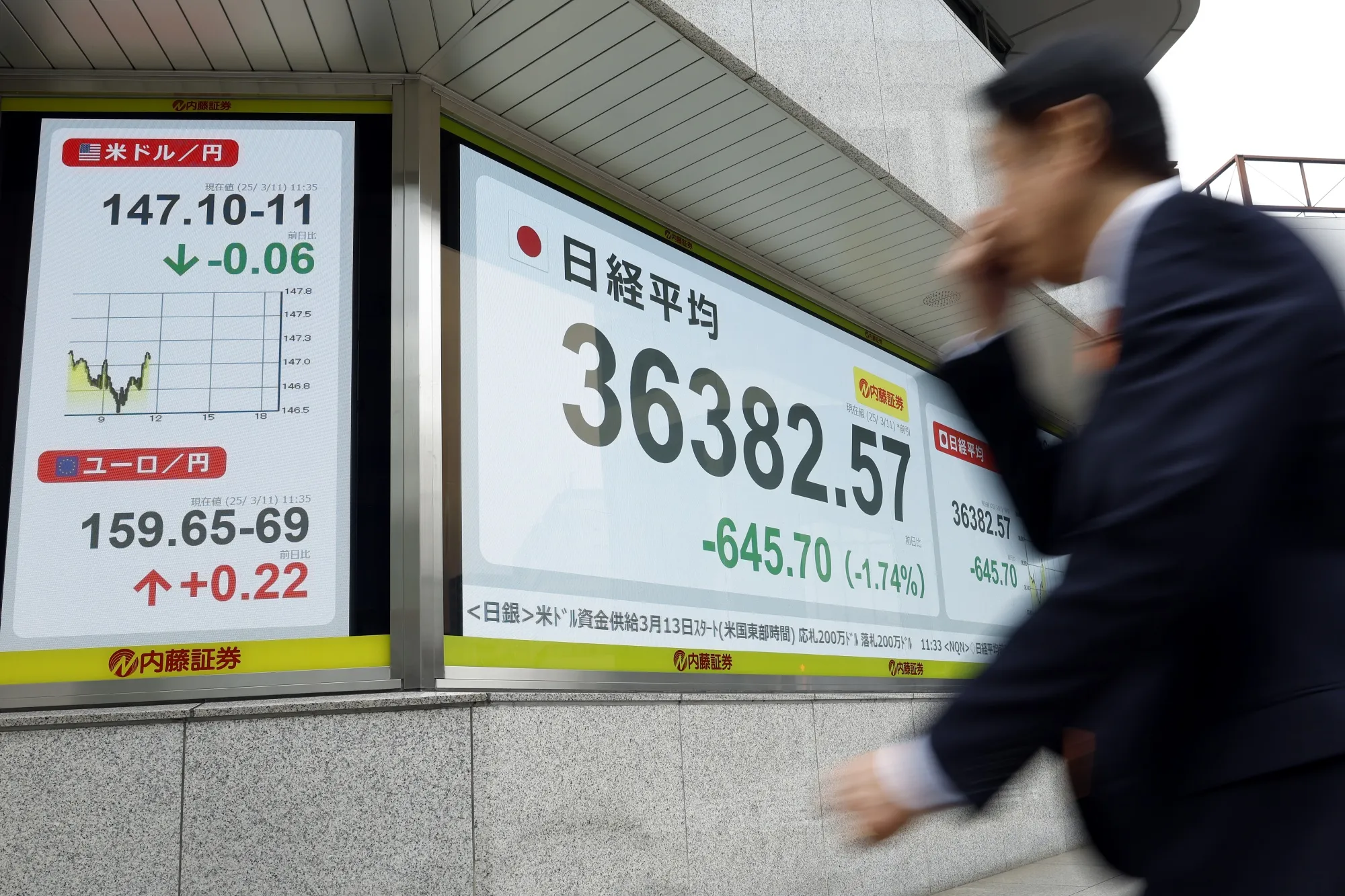2025年3月11日星期二,東京的一塊電子顯示屏。照片:Kiyoshi Ota/Bloomberg從拋售美股轉投中資股,到買入日元和歐元,交易員們正急於尋求避險,同時研究美國市場可能崩盤的觸發因素。