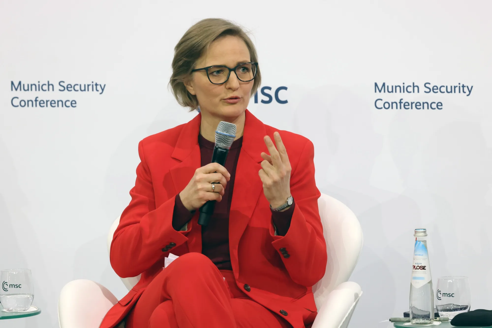 2025年2月16日星期日,弗蘭齊斯卡·布蘭特納在德國慕尼黑安全會議圓桌討論現場。來源:彭博社德國綠黨已準備好進行談判,希望在本週末前與弗里德里希·梅爾茨領導的潛在執政聯盟就國防開支爭議達成協議。