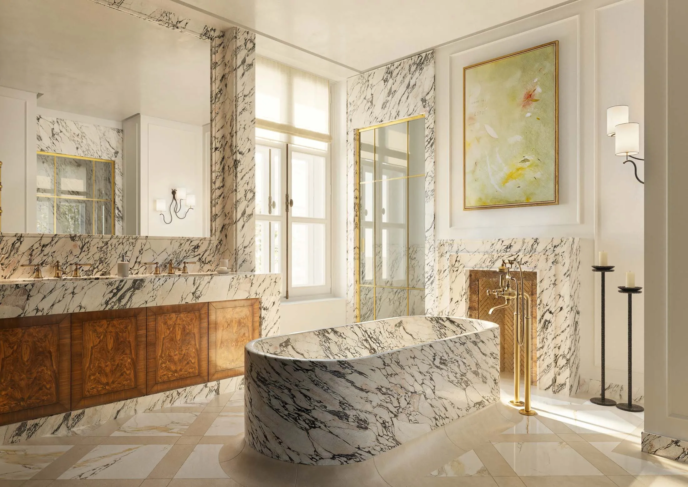 其中一套住宅浴室的渲染圖。來源:梅伯恩七套住宅將由奢侈品牌御用設計師皮埃爾-伊夫·羅雄操刀,其代表作包括紐約華爾道夫酒店和倫敦埃默裏酒店,其餘16套則由負責卡地亞旗艦店及即將開業的紐約老佛爺百貨的設計師勞拉·岡薩雷斯打造。全屋配備傢俱與裝飾的公寓將設有奢華大理石廚房、水晶吊燈、獨立浴缸和古銅五金件。
