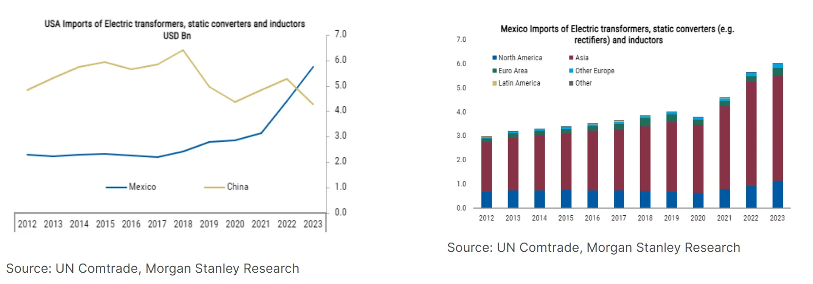 攝影師:來源:ISM攝影師:來源:ISM即便在將變壓器生產轉移至美國方面付出了相當可觀的努力,短缺問題依然存在。施耐德電氣、西門子能源和ABB等歐洲公司一直在美國投資建廠。(例如施耐德表示,自2020年以來已在美國工廠投資了驚人的4.4億美元)。大量生產也已轉移至墨西哥,如下表所示。根據官方數據,美國現在從墨西哥進口的變壓器已超過中國。與此同時,美國從墨西哥進口更多變壓器之際,墨西哥自身也從中國進口了更多變壓器及零部件。實際上,摩根士丹利指出,墨西哥進口變壓器的價值幾乎等同於其對美出口值。生產仍集中在亞洲。