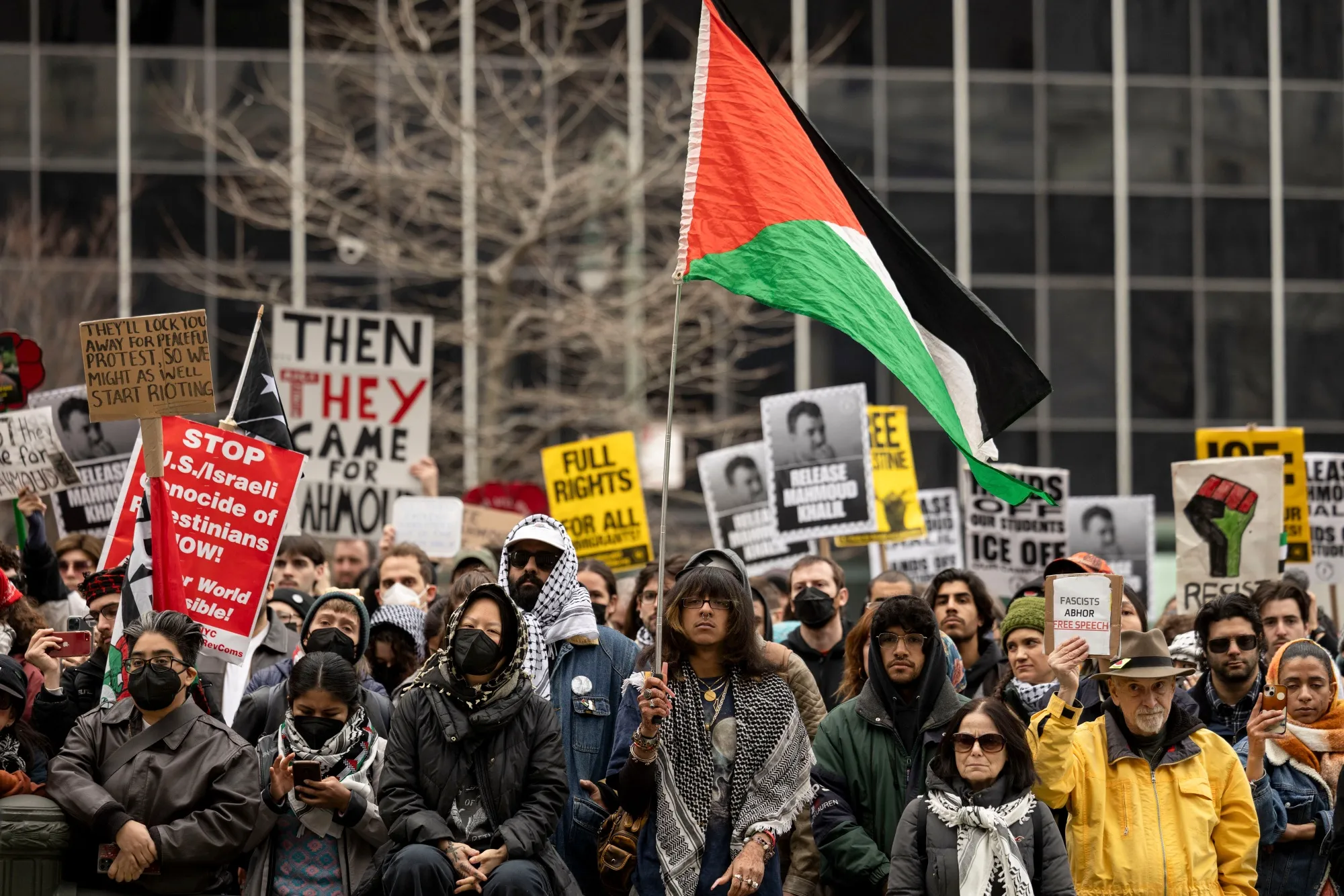 抗議者在瑟古德·馬歇爾聯邦法院外集會聲援馬哈茂德·哈利勒。攝影師:Yuki Iwamura/彭博社在西海岸,加州大學洛杉磯分校新任校長鬍里奧·弗蘭克也發起了一項打擊反猶太主義的倡議。