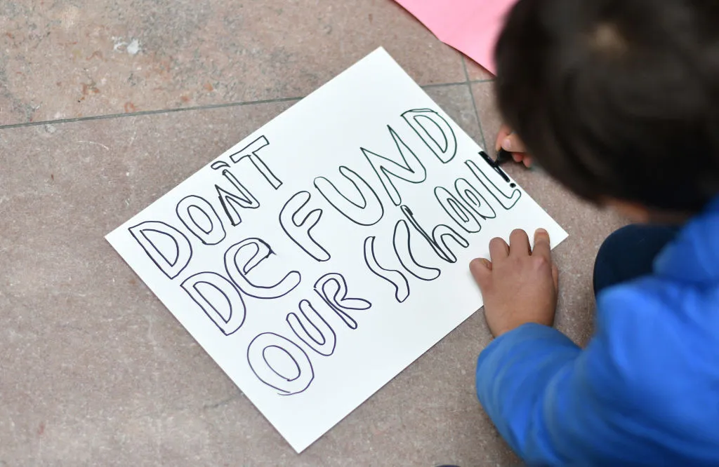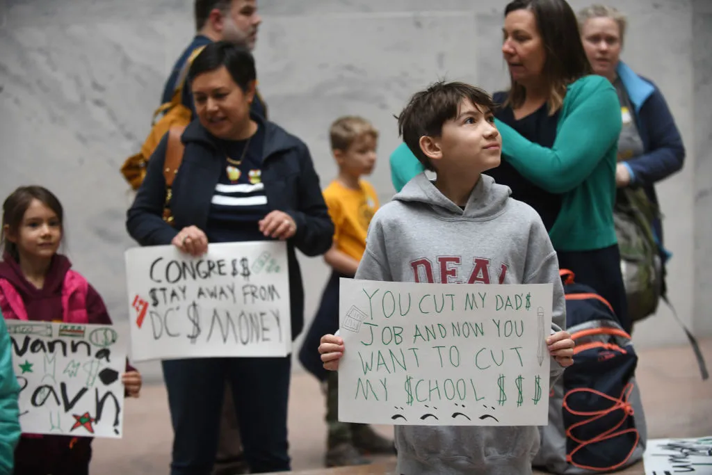 週四,學生、家長、教師和華盛頓特區其他居民聚集在參議院哈特大樓中庭,抗議即將實施的預算削減。