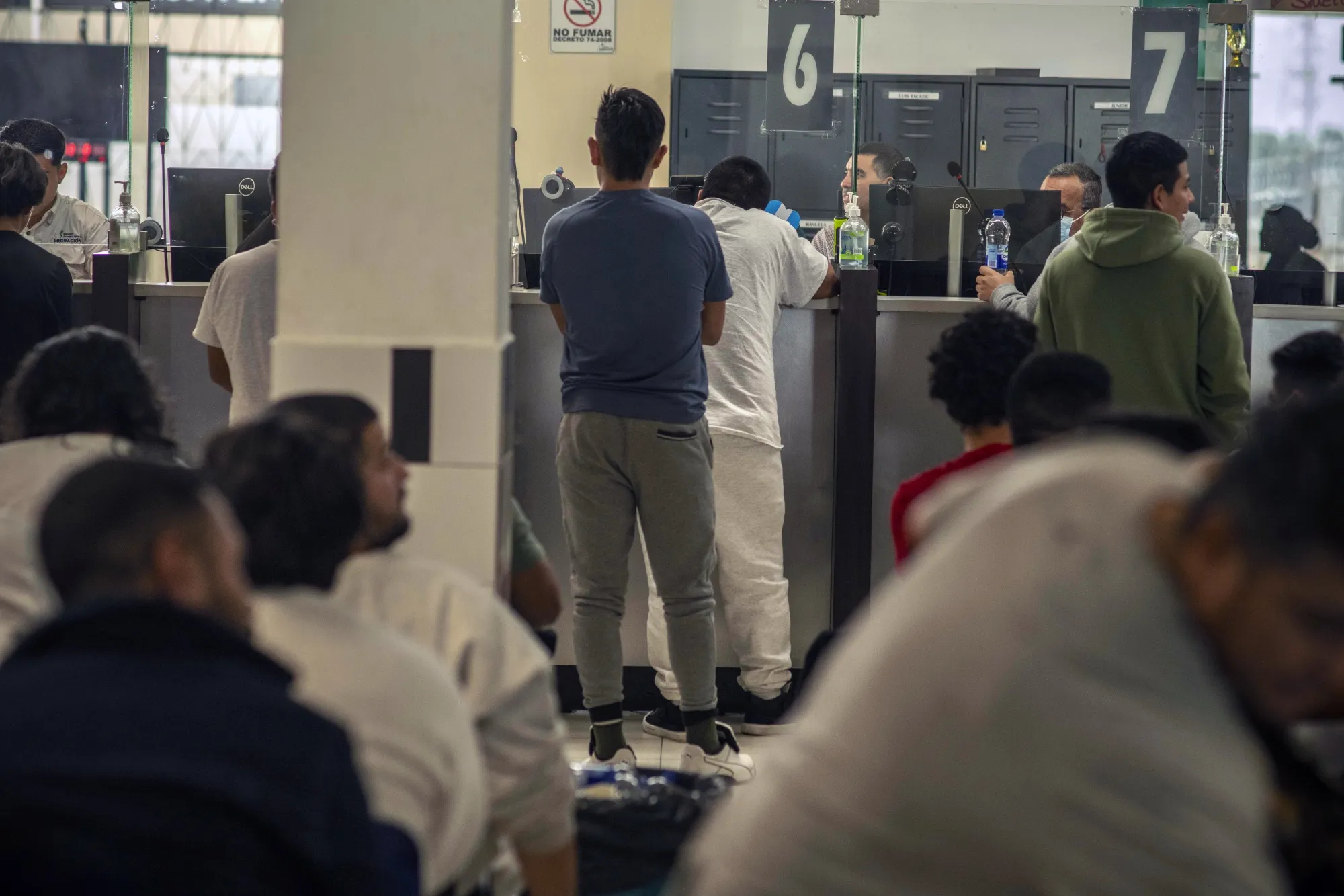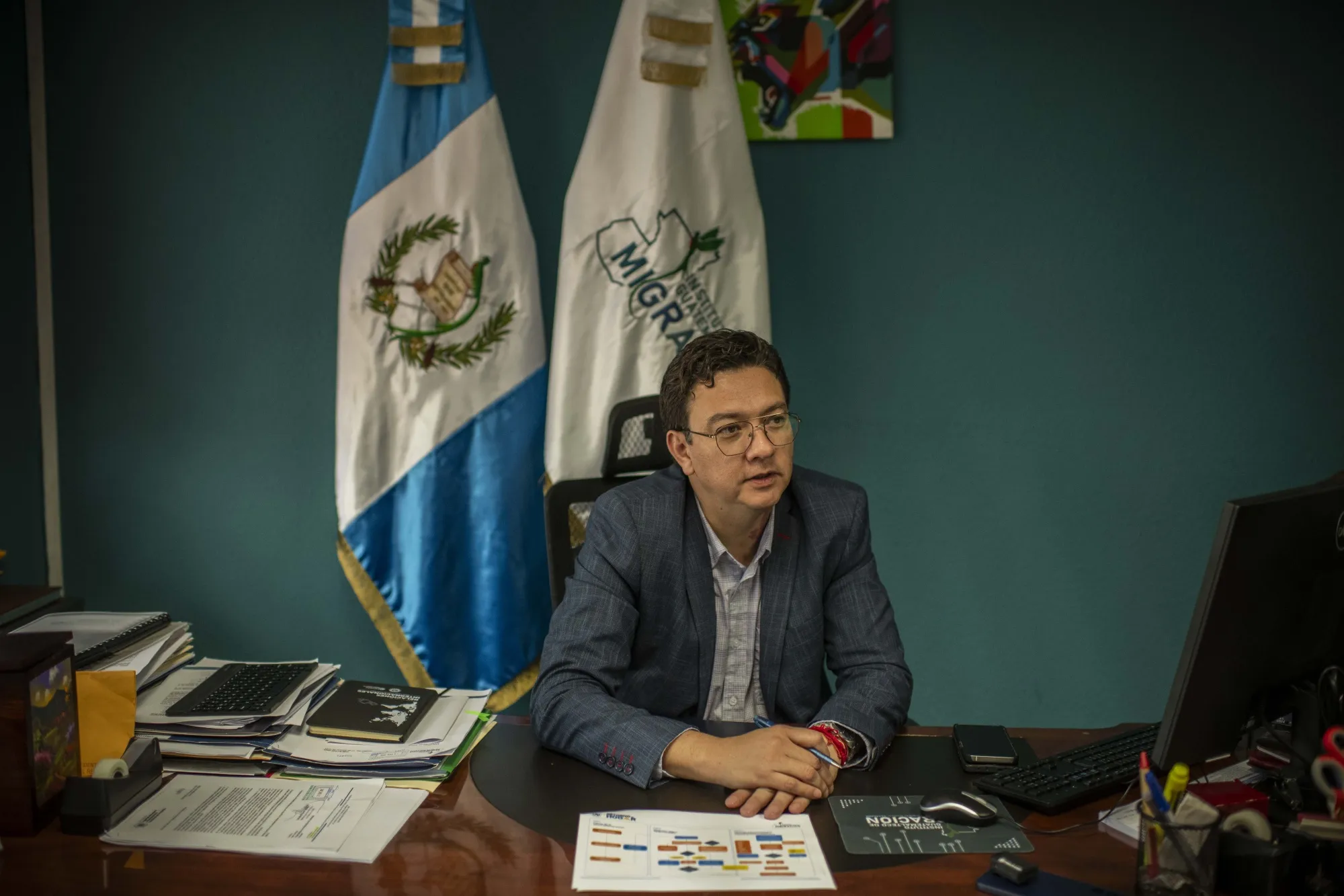 危地馬拉移民局局長Danilo Rivera照片:Daniele Volpe/Bloomberg被驅逐出境的危地馬拉人降落在危地馬拉城主要國際機場跑道另一側的空軍基地。在一間裝飾着鮮豔色彩的辦公室裏,新來的人會收到一袋零食,可以免費打電話,乘坐交通工具前往公交車站,並兑換貨幣。
