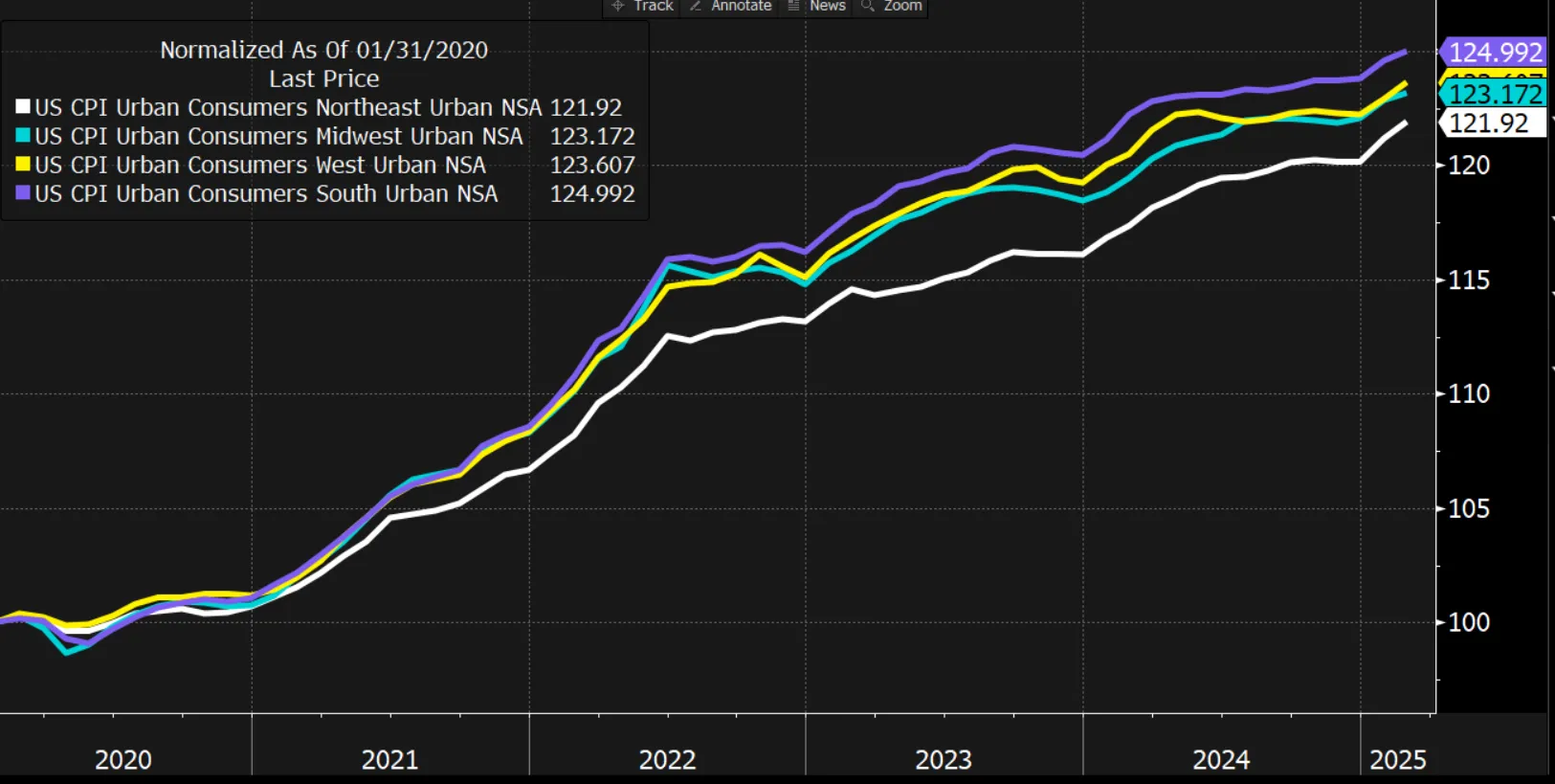 這或許是我們自疫情以來觀察到地區通脹差異擴大的原因之一。例如下圖顯示了美國勞工統計局追蹤的四大都市區CPI走勢(數據以2020年初為基準標準化),南方地區的價格上漲幅度普遍高於東北部。