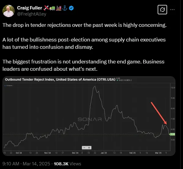 來源:X來源:X補充説明:當貨運需求高漲時,承運商拒單率會上升,這意味着他們有權拒絕接單。當卡車運輸服務需求旺盛時,承運商不必與你合作。而當曲線下行時,則表明承運商更迫切希望獲得業務。
