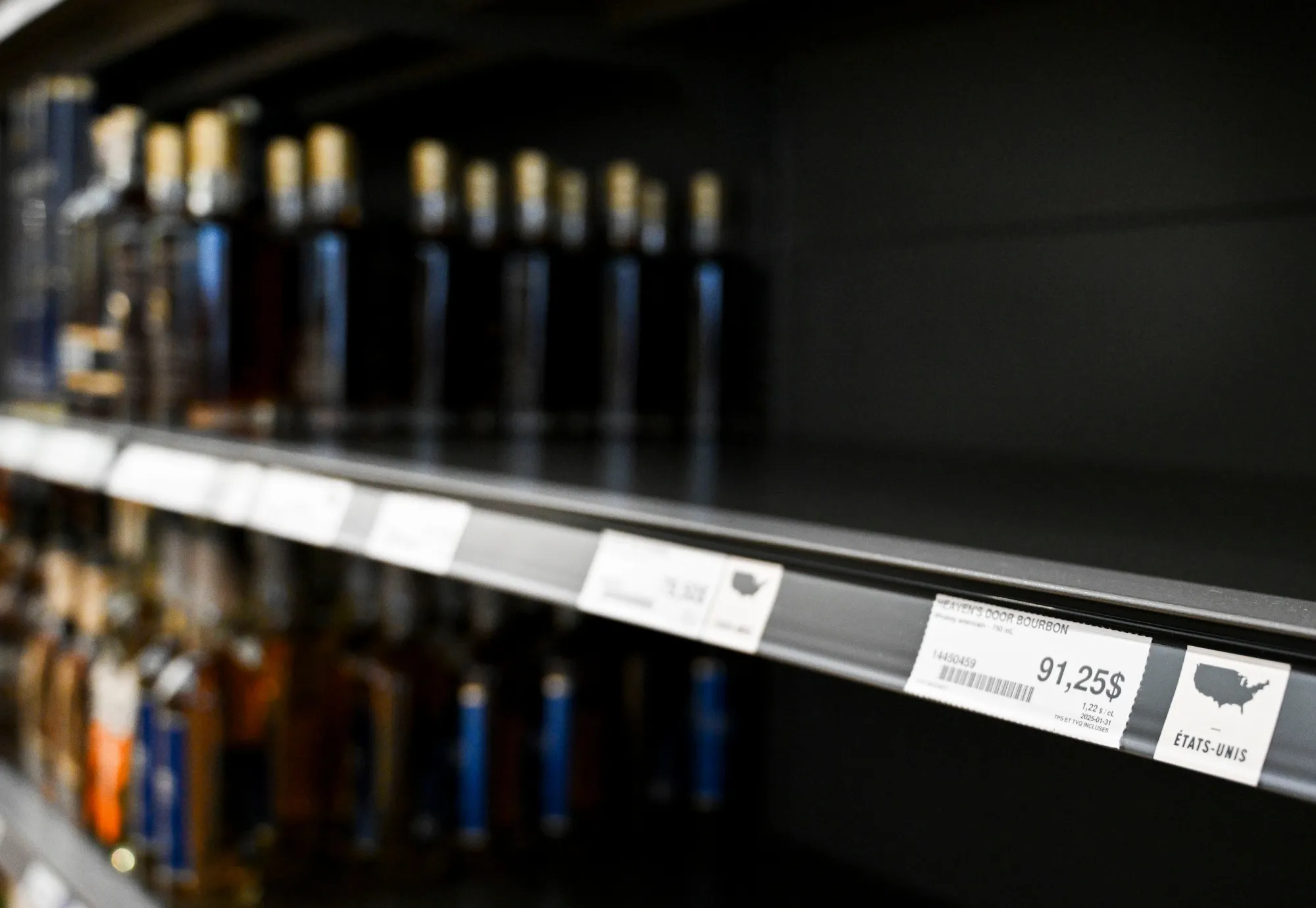 魁北克酒類專賣店貨架上,原本擺放美國產烈酒的位置如今空蕩蕩,只剩下一張天堂之門波本威士忌的價格標籤。