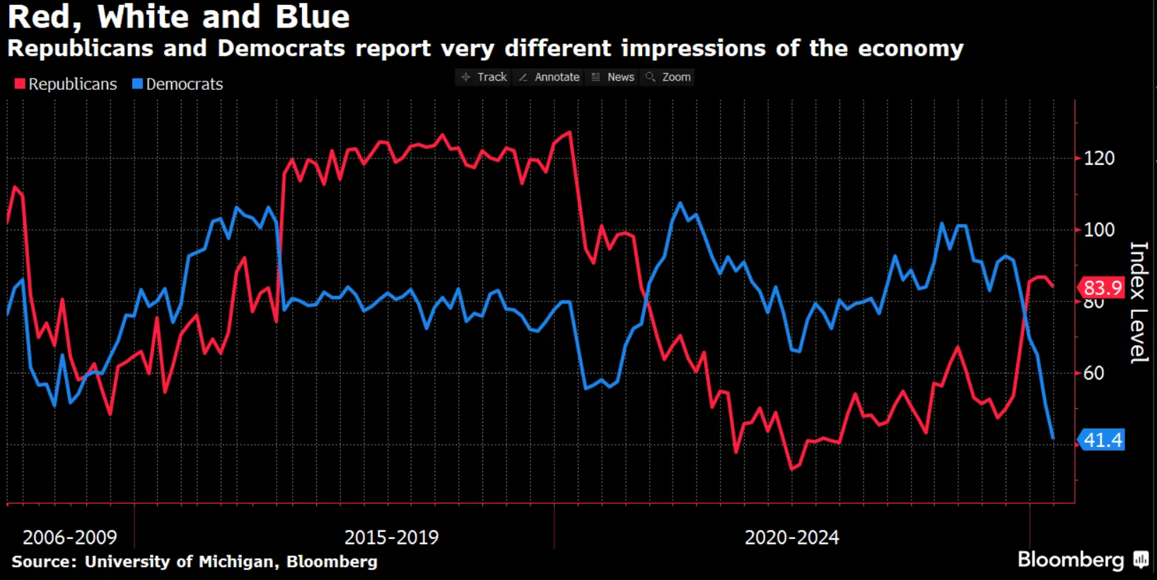 今日公佈的密歇根大學數據顯示消費者信心指數暴跌。但共和黨人仍比民主黨人樂觀得多。雖然有趣的是,這個創紀錄的差距正在開始縮小。