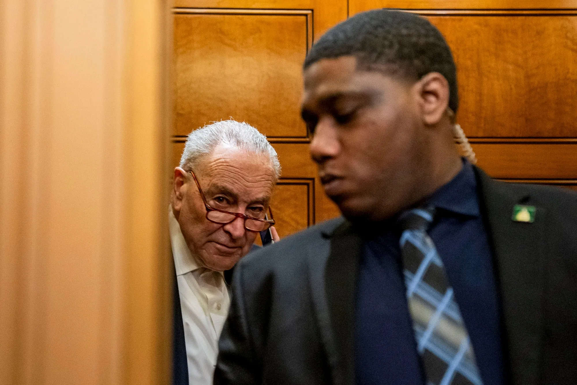 週五,美國國會大廈內,參議院民主黨領袖查克·舒默(左)。攝影師:艾莉森·羅伯茨/彭博社舒默的讓步及資金方案的通過,對特朗普和眾議院議長邁克·約翰遜而言是一場政治勝利。他們竭力確保該方案不限制馬斯克的政府效率部削減成本行動,並維持政府資金至9月30日聯邦財年結束。