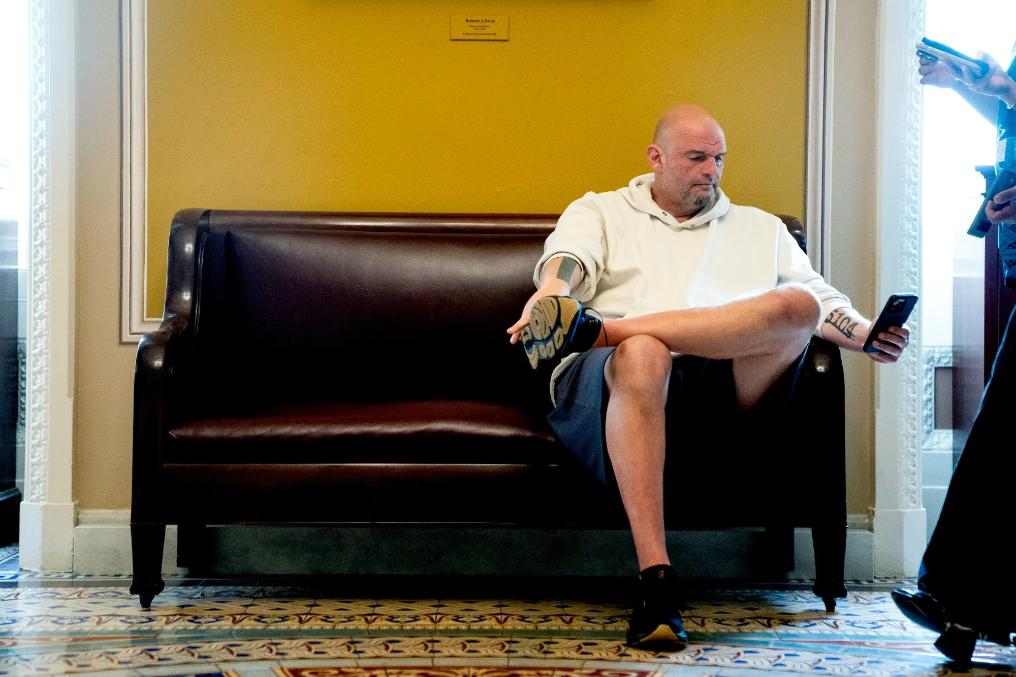 約翰·費特曼參議員週五在國會大廈。攝影師:艾莉森·羅伯/彭博社賓夕法尼亞州參議員約翰·費特曼是首位公開反對政府停擺策略的民主黨人,他表示停擺支持者並未闡明解決危機的出路。