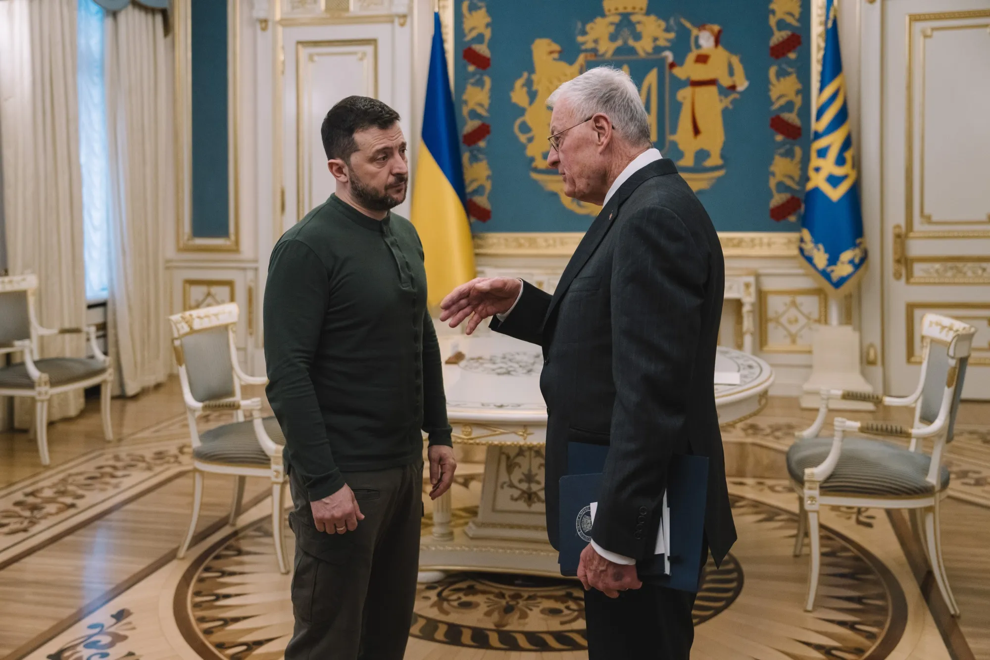 美國烏克蘭問題特使基思·凱洛格(右)與烏克蘭總統弗拉基米爾·澤連斯基於二月在基輔會晤。