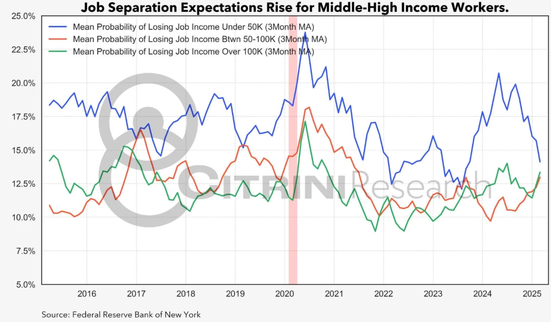 來源:RenMac,密歇根大學但再次強調,當前總量數據的參考價值有限。這裏有個分析角度:按收入層級分解勞動力市場預期。為此我們參考紐約聯儲的消費者預期調查。該調查同樣顯示受訪者預期失業率將攀升。但若按收入劃分,情緒變化主要來自中高收入羣體。收入較低者反而報告失業風險下降。