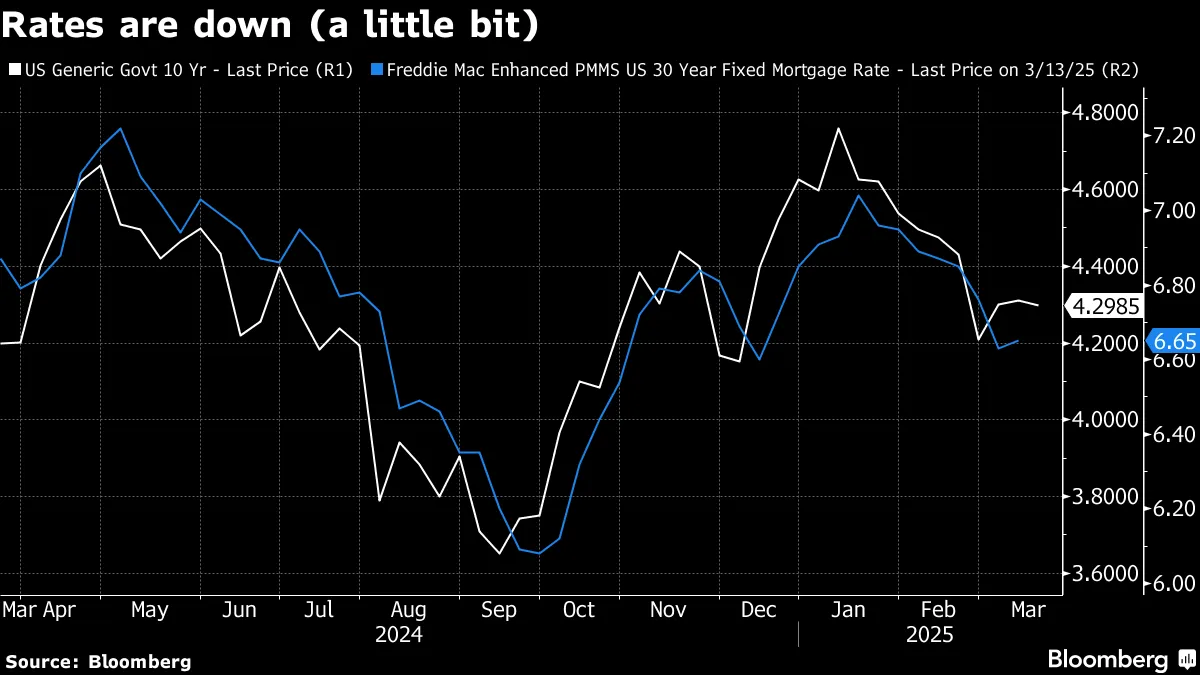 值得注意的是,近期股市拋售中我們並未獲得顯著的利率緩解。十年期國債收益率雖從1月峯值回落,但4.3%的水平仍處於過去一年的中位區間,且略高於去年同期。房貸利率有所下降,但幅度有限。