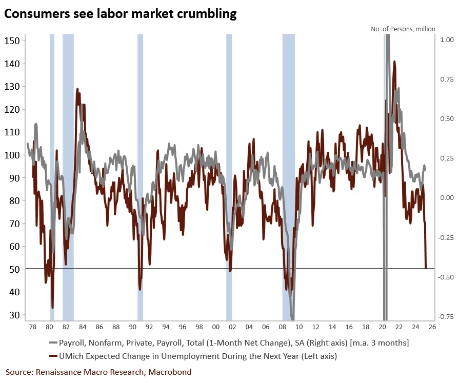 上週公佈的密歇根大學消費者信心調查中,一個數據點尤為突出。調查顯示就業市場預期呈現斷崖式下跌,直逼2008年金融危機以來的最低水平。