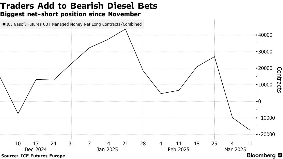 柴油需求與經濟活動密切相關,因此特朗普關税政策及報復性措施的任何威脅都會加劇市場看跌情緒。在美國,消費者信心走弱已經凸顯出這個全球最大經濟體增長前景面臨的風險。不確定性打擊了各類市場情緒,標普500指數較年內高點下跌約8%。