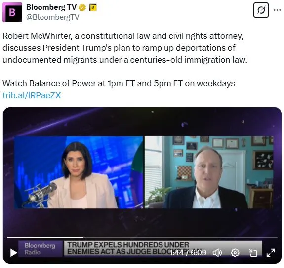 今天下午1點,彭博電視台的權力平衡早間版節目中,主持人喬·馬修和凱莉·萊因茨採訪了憲法和民權律師羅伯特·麥克沃特,討論了特朗普利用1798年的一項法規驅逐數百名移民的做法,這可能會引發與法院的衝突。