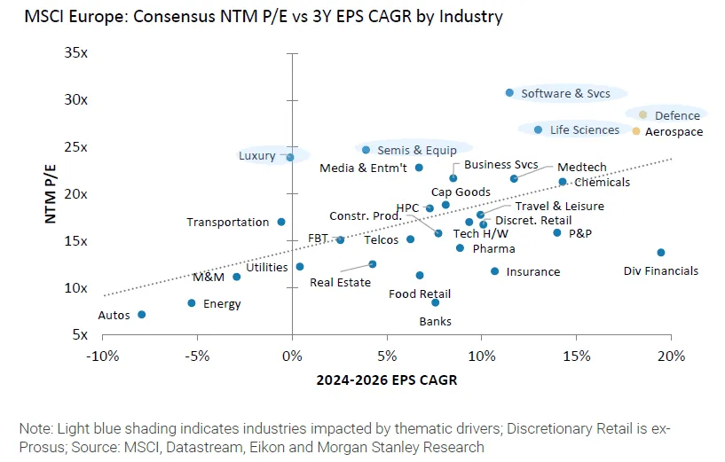 股票估值已迅速調整以反映這一消息。摩根士丹利提供的歐洲行業圖表顯示,縱軸為未來12個月市盈率,橫軸為預期盈利增長率。國防和航空航天業目前擁有最高的預期增長率,以及這種樂觀情緒所暗示的盈利倍數。處境艱難的汽車行業則處於另一端。因此,內部市場已針對新的政治現實做出重大調整: