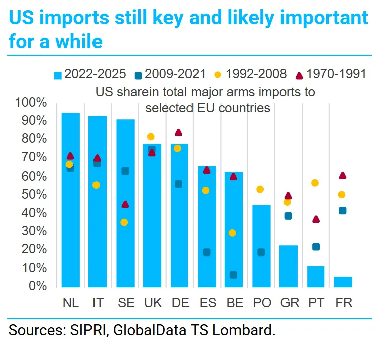 這合理嗎?在下屆總理熱門人選弗里德里希·梅爾茨上週爭取綠黨支持後,該方案几乎確定能通過。這確保了聯邦議院通過所需的三分之二多數票,而且方案內容甚至得到了加強。綠黨成功爭取到將1000億歐元基礎設施支出用於環保目標,但更重要的是確保了方案中所有資金均為真正增量,不得用於抵消減税或其他優先事項。該方案仍需獲得聯邦參議院批准(可能性較大)並通過憲法法院審查——目前看來法院已排除干預可能。這張來自TS Lombard的圖表顯示,包括德國在內的許多歐洲國家在軍備方面嚴重依賴美國。這種情況難以迅速改變。但法國(歐盟內對大西洋主義最不熱衷的國家)逐步大幅降低對美依賴的經驗表明,歐洲自身將承擔越來越多的防務責任。當前歐洲確實存在減少對華盛頓依賴的強烈政治意願:
