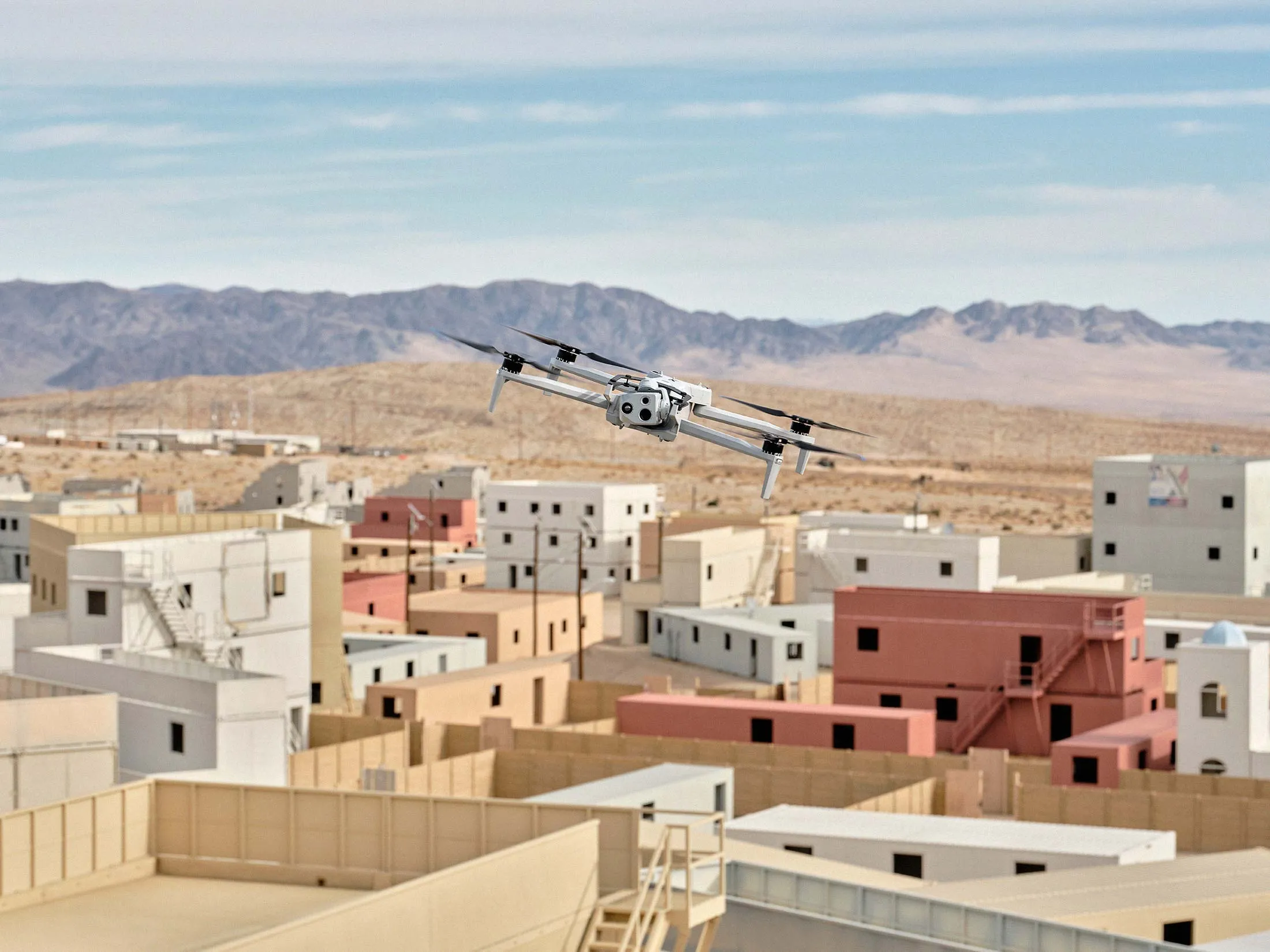 加利福尼亞州二十九棕櫚村海軍陸戰隊空地作戰中心內的X10D無人機。攝影師:Philip Cheung為《彭博商業週刊》拍攝二十九棕櫚村的飛行測試是認證流程的環節之一。Skydio及其30餘家競爭對手——包括Parrot Drone、Shield AI和Anduril——均參與了測試。大部分測試在一處依傍廣闊岩石山坡的巨型城市作戰訓練場進行。場內1500棟空置建築多為裸露混凝土結構,留有窗洞,彷彿半途廢棄的沙漠爛尾工程。區域內還設有清真寺、堆滿蒙塵塑料農產品的市場,以及街道上焚燬的汽車殘骸。