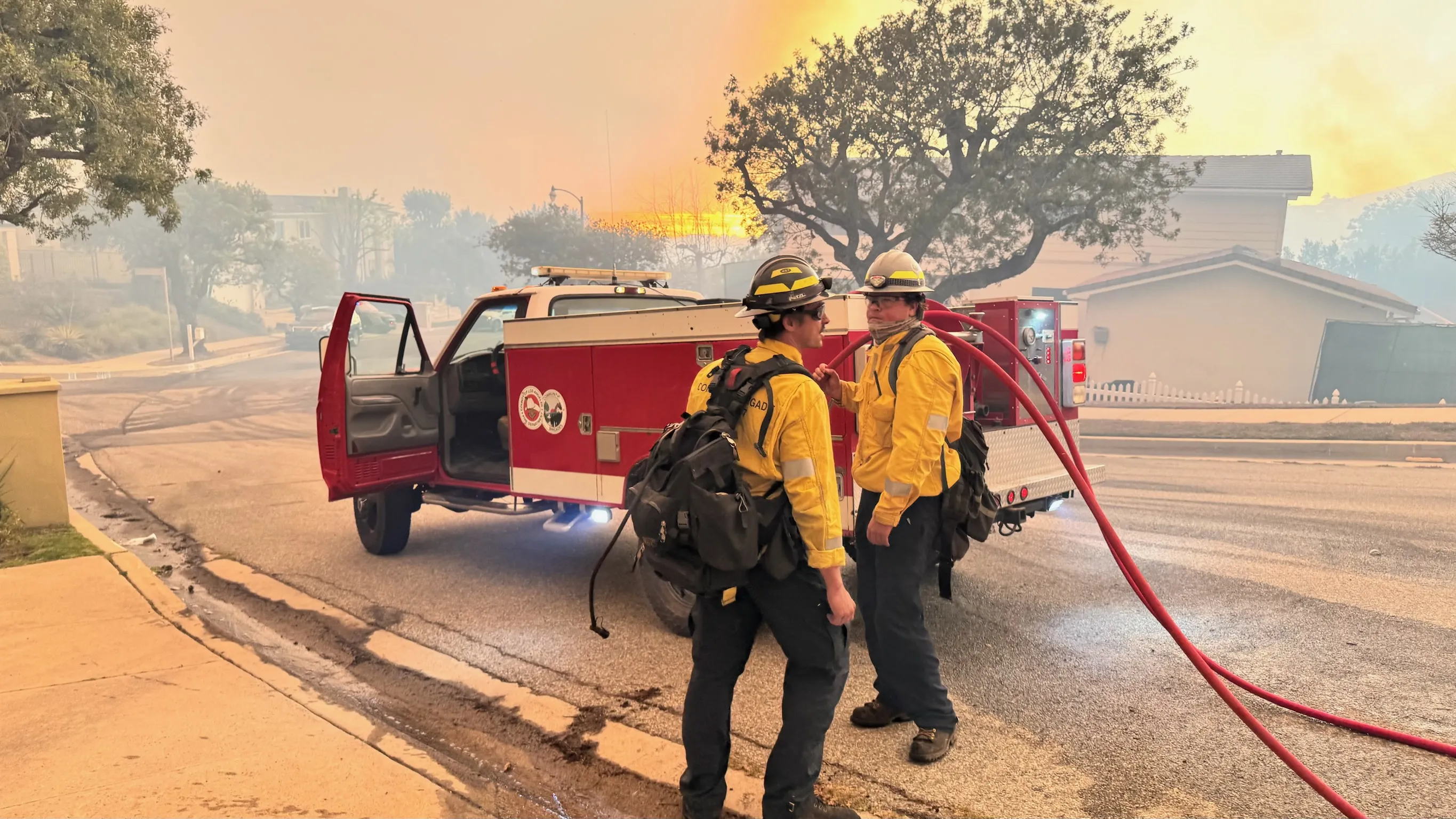帕利塞茲火災期間,社區消防隊員通過逐户敲門敦促居民撤離,併為高危建築灑水降温來協助消防員。攝影師:傑克·伯格哈特其他問題不僅限於這場火災,伍德沃斯和合著者指出,聖莫尼卡山脈社區的設計本身就缺乏防火彈性。從庭院景觀到房屋建材,他們認為需要明確業主在降低風險中的作用,並希望找到系統性解決這些問題的方法。