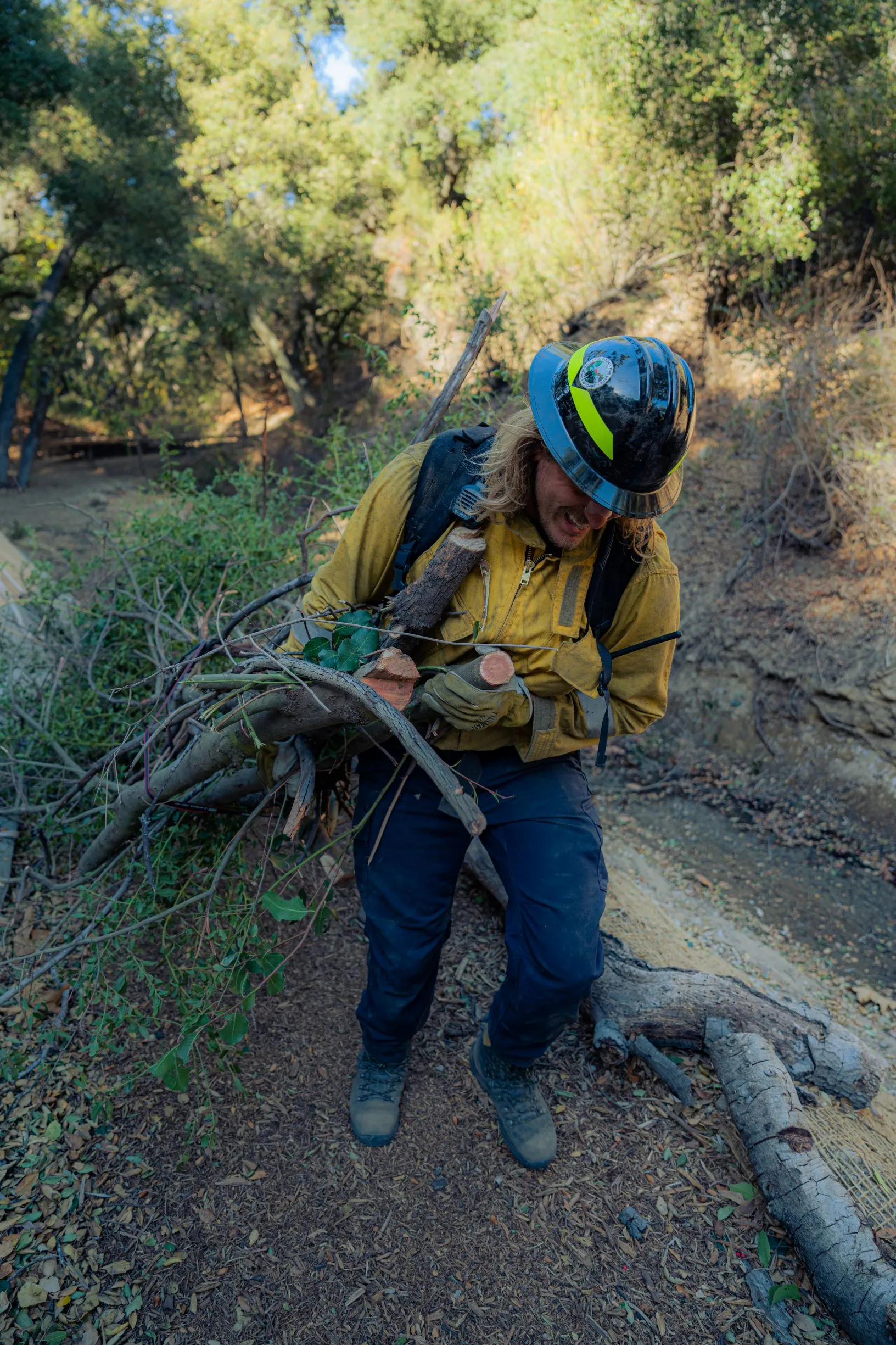 庫珀頭戴頭盔,身穿防火黃色夾克,着裝如消防員,訓練如消防員,並獲准進入仍對公眾封閉的火災區域。但他並非職業消防員——他是洛杉磯縣消防局合作試點項目的一員,旨在加強聖莫尼卡山區的社區野火防範與應對能力。
