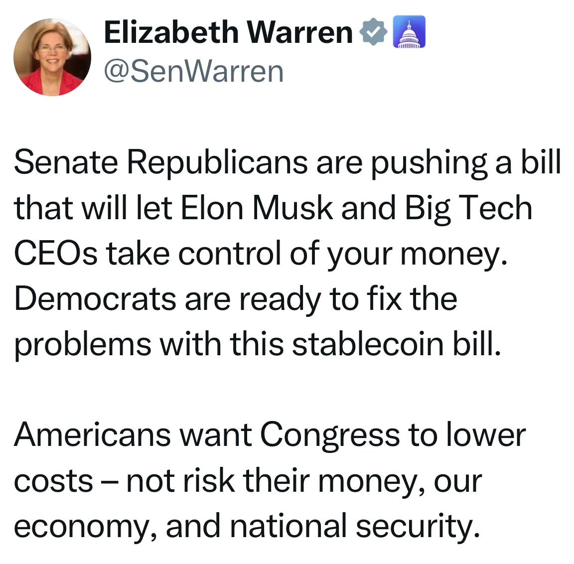 如果獲得主賬户訪問權限,穩定幣發行方將比現行法案允許的更類似於銀行——這一可能性正遭到以參議員伊麗莎白·沃倫為首的民主黨反對派的強烈抵制。目前,美國不允許商業公司發行自己的貨幣。如果GENIUS法案通過,像埃隆·馬斯克的社交媒體平台X這樣的公司將能夠發行自己的穩定幣,沃倫在一份聲明中寫道,“這在功能上等同於銀行存款。” 共和黨支持者則反駁稱,支付型穩定幣本質上不同於銀行產品,因為發行方不提供貸款或信貸產品,且代幣由儲備金一對一支持,不存在再抵押行為。