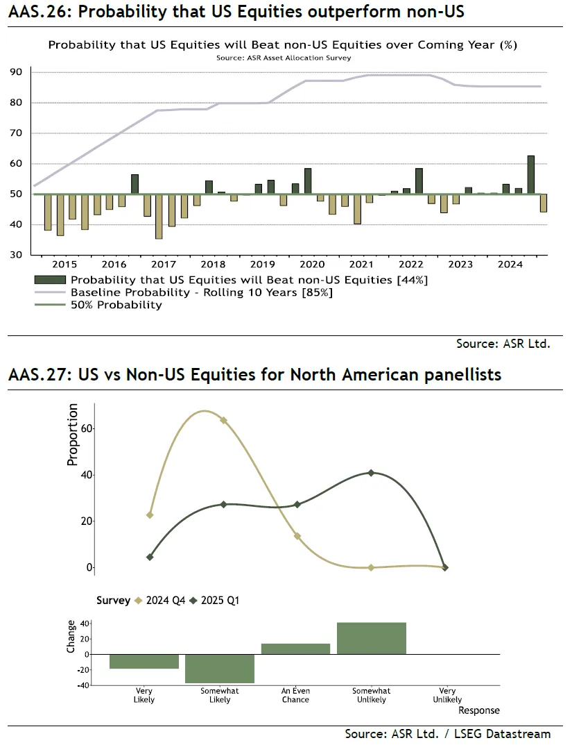 本月初,絕對策略研究公司開展的資產配置者季度調查(要求受訪者對市場走勢進行概率預測)已預示這一趨勢——認為美國將跑贏其他市場的比例出現斷崖式下跌: