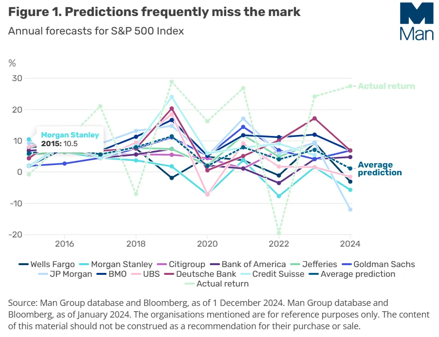 這一結論基於兩個核心洞見。首先,標普500指數難以預測。Man集團的這張圖表將華爾街大行的年終預測與實際結果進行對比。自2016年以來,標普500指數每年收盤價不是高於最高預測值,就是低於最低預測值。
