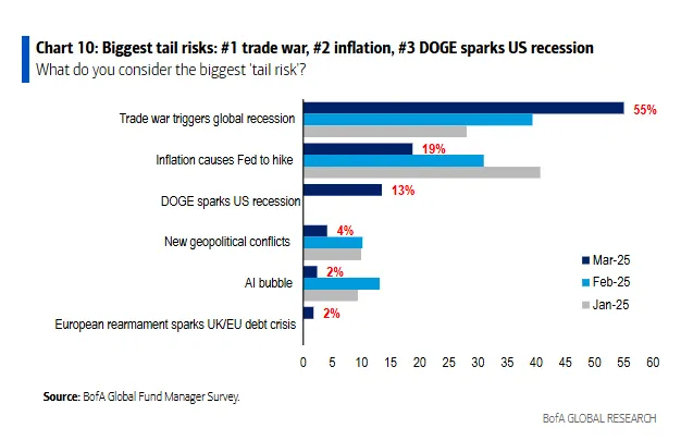 重振美股信心、緩解投資者焦慮的關鍵在於華盛頓政策。無論對錯,多數投資者現在認為貿易是當前最大風險;美銀調查中超50%受訪者將衰退性貿易戰列為首要"尾部風險”,這是自2020年4月投資者擔憂"疫情復燃"以來,對單一尾部風險的最高共識: