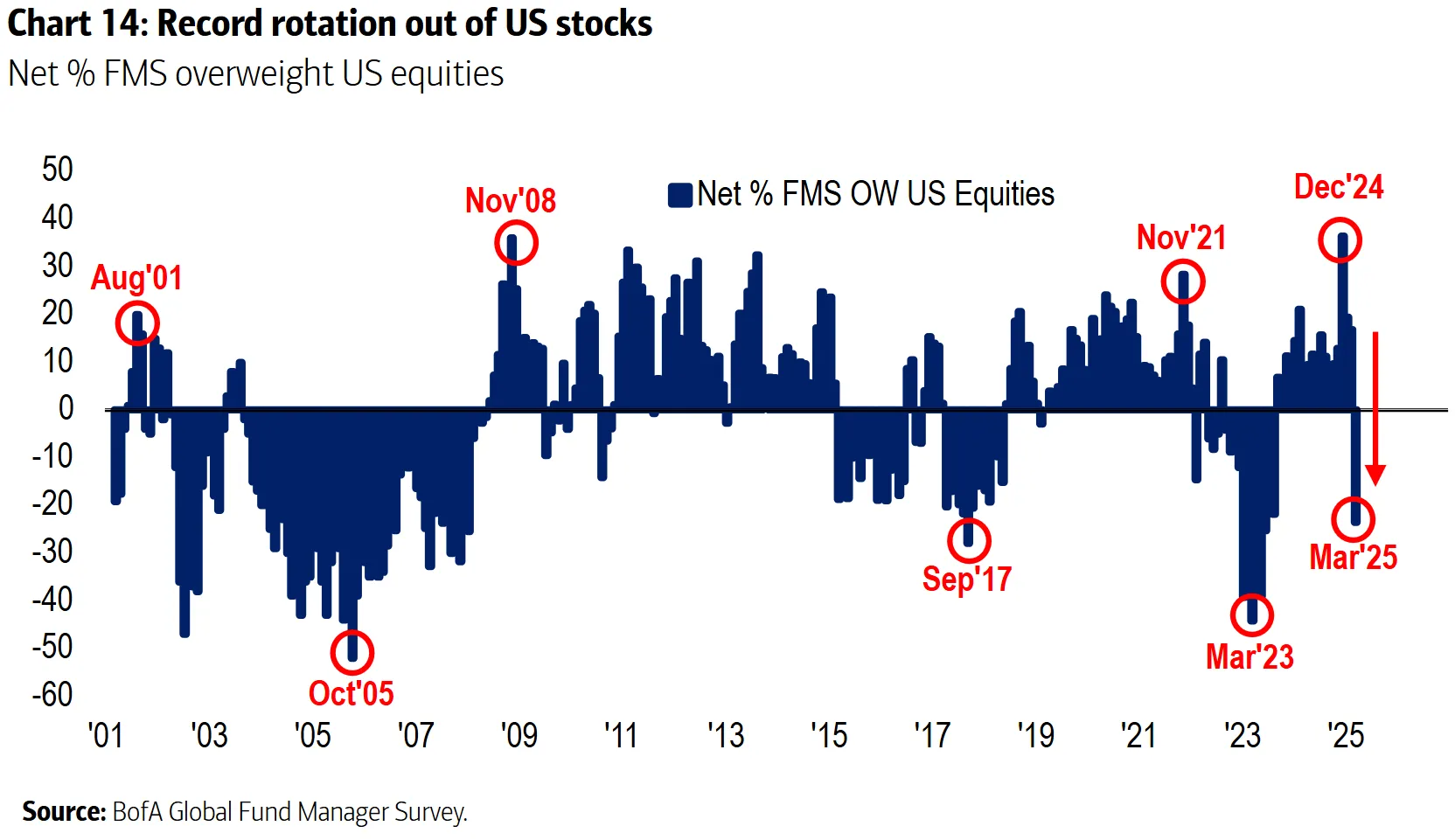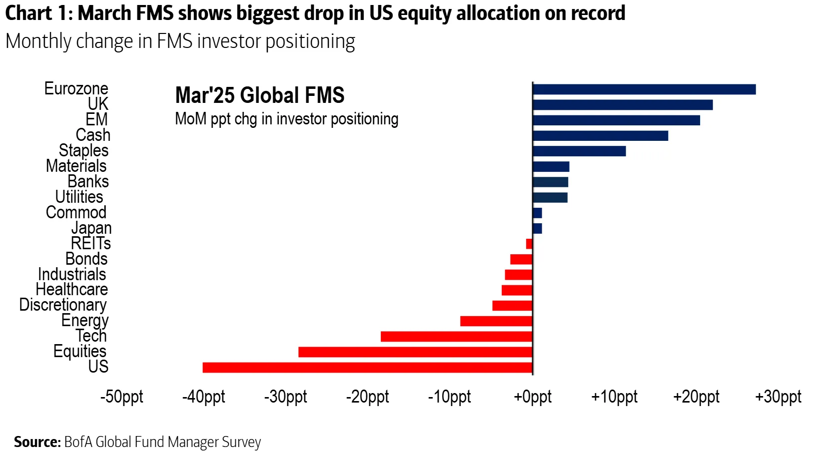 美國銀行調查顯示,過去四周基金經理從美國市場撤離的規模創下有記錄以來之最。與市場價格走勢如出一轍,資金轉向來得突然而劇烈: