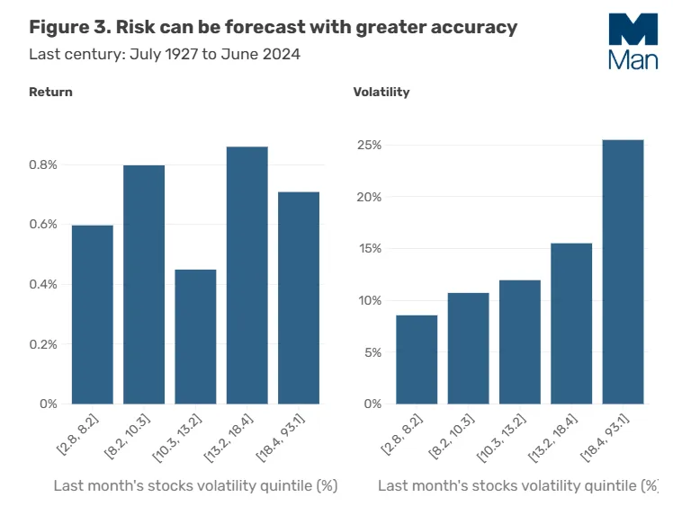 其次,雖然某隻股票在特定月份的波動性對其最佳月份回報率的預測作用有限,但對衡量下個月波動率非常有用。這是因為波動性往往具有持續性和聚集性;即近期的高波動性往往會在短期內持續。正如這項研究所指出的,這一發現幫助羅伯特·恩格爾憑藉其ARCH模型獲得了2003年諾貝爾經濟學獎。高風險高波動的股票往往保持這種特性,表現平淡更穩定的股票亦是如此。這是Man集團用1927至2024年月度回報數據對這一現象的説明: