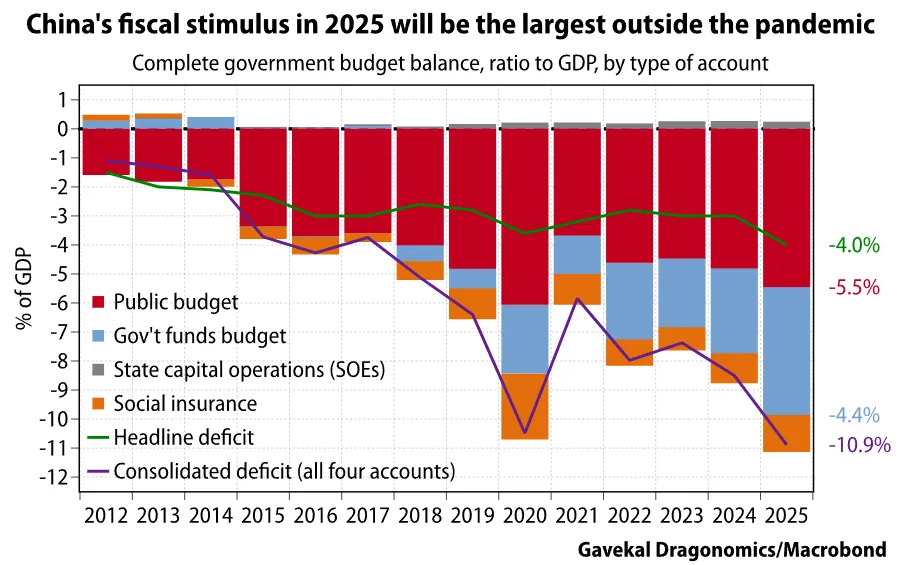 龍洲經訊的安德魯·巴特森估算,在彙總所有政府收入、扣除支出並抵消賬户間轉移後,2025年實際財政赤字將達到GDP的10.9%。這遠高於官方公佈的4%數據,相當於GDP的2.4%財政刺激力度,是北京目標值的兩倍多,巴特森表示。
