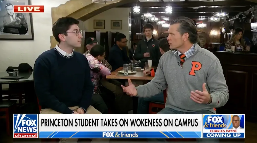 2023年接受福克斯新聞採訪時,亞當·霍夫曼告訴主持人皮特·赫格塞斯(現任特朗普政府國防部長),他會建議年輕保守派不要害怕表達觀點。來源:福克斯新聞霍夫曼長期倡導大學校園言論自由。他在2023年《紐約時報》專欄文章中指出"清教徒式的進步主義校園"正將保守派學生推向更右翼的政治立場。