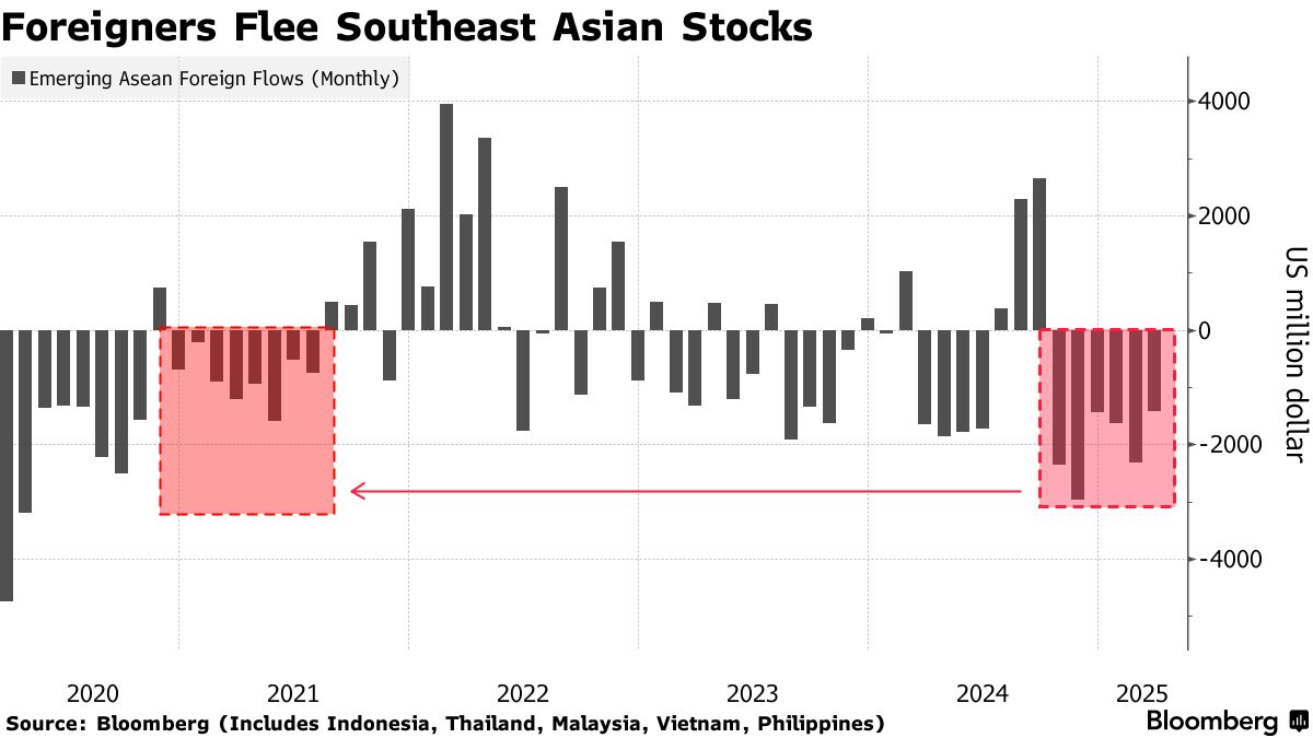 彭博彙編數據顯示,東南亞五個市場正面臨外資連續第六個月撤資。其中印尼今年以來已流失近18億美元,成為區域內資金外流最嚴重的國家。