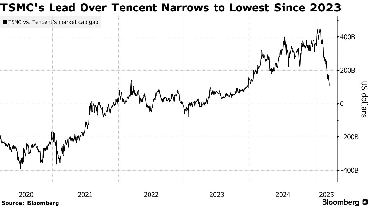 台積電股價年內下跌11%,與英偉達等全球芯片股同步下挫,行業估值泡沫引發市場擔憂。同期騰訊股價在2025年上漲約30%,使兩家企業的市值差距縮小至約1090億美元,創2023年末以來最小差值