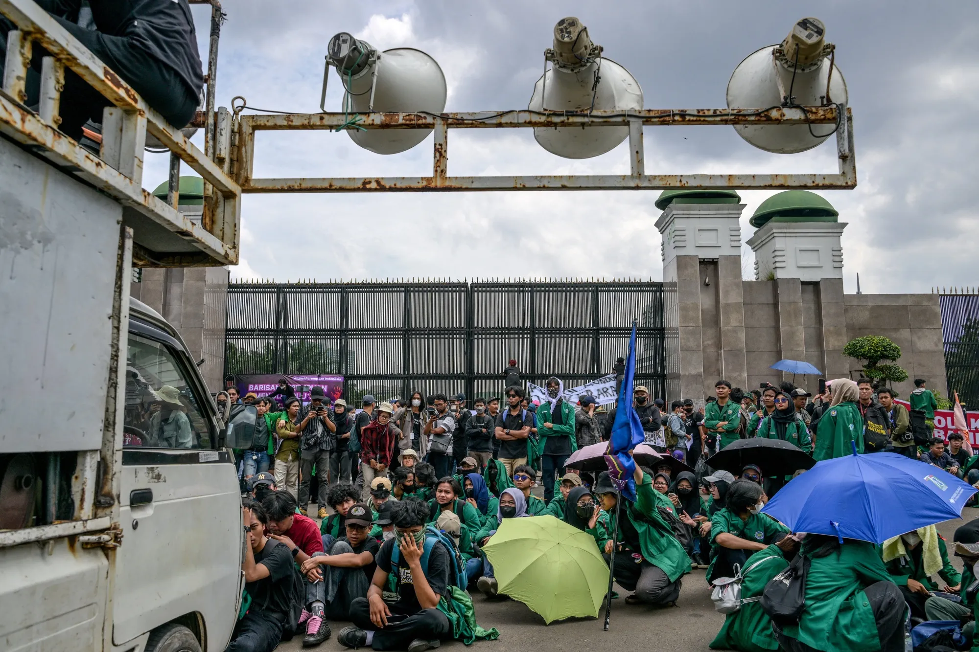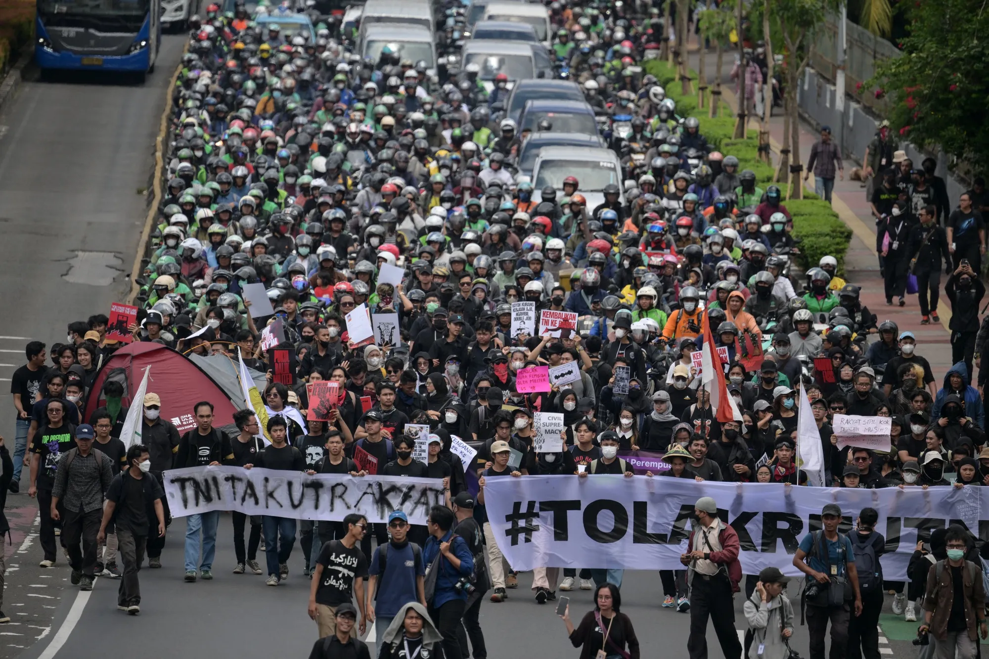 據Kompas電視台直播畫面顯示,議會大廈外,學生抗議者聯盟展開橫幅,其中一條寫着"維護文官至上原則"。