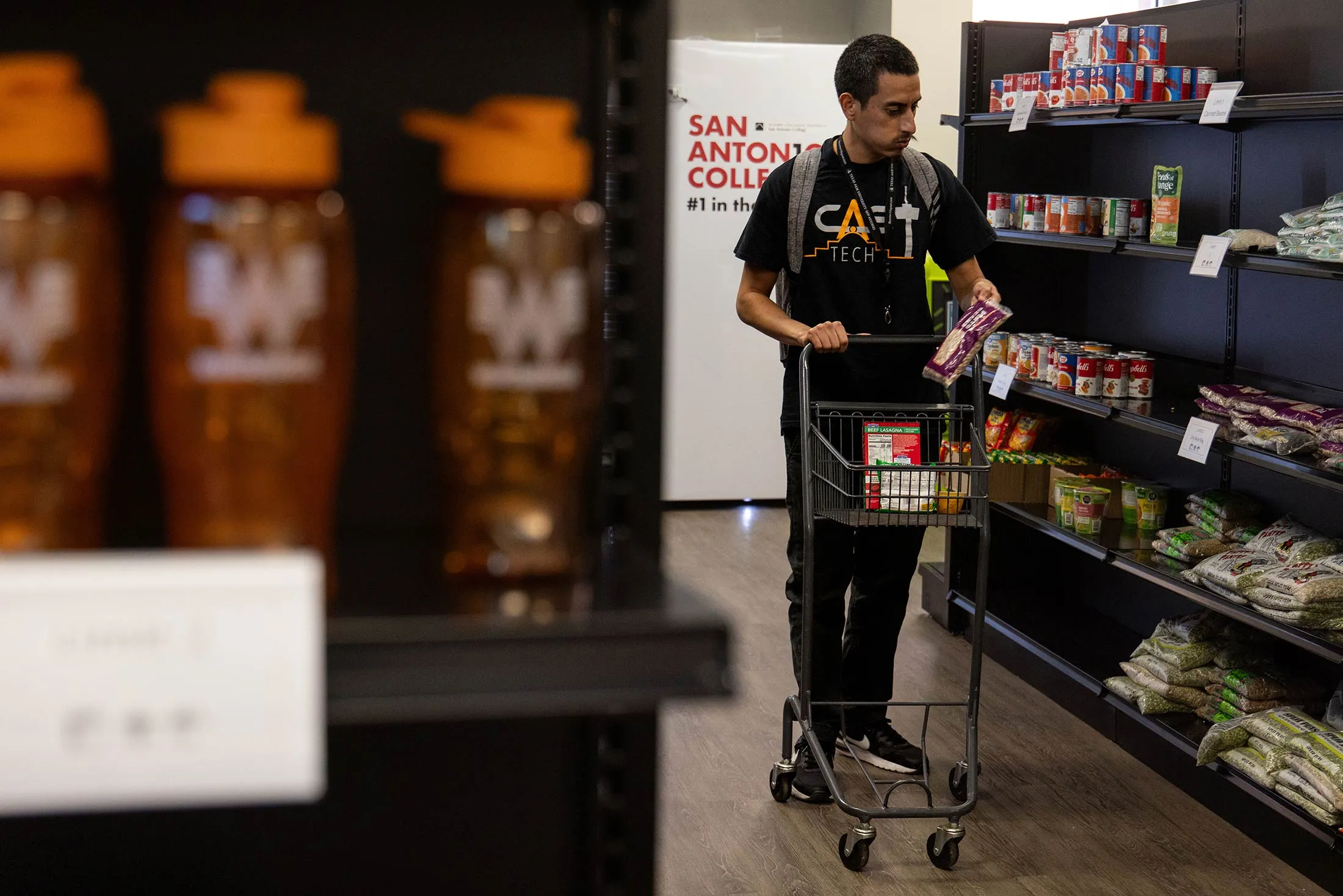 商學院學生何塞·加西亞在聖安東尼奧阿拉莫學院區援助中心的校園資源站領取食品和衞生用品。攝影師:Kaylee Greenlee為《彭博商業週刊》拍攝立志成為護士的奎利亞爾正是2023年秋季遭遇工時縮減後又生病的受助學生之一。“他們支付了我的房租、車貸和電費,“她説道,“整整兩個月承擔了所有這些開支,這才讓我能完成秋季學期的學業。”