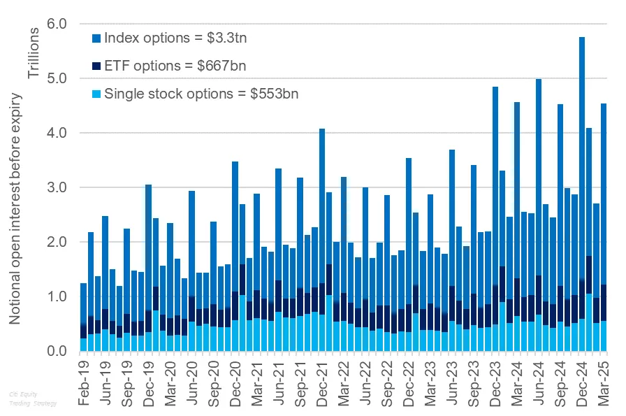 來源:花旗集團美國股市從上週低點反彈的勢頭將在本週五面臨新考驗,屆時大量期權合約即將到期,這一季度性事件在過去常引發市場波動加劇。
