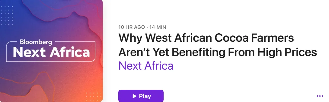 彭博社的Mumbi Gitau與Jennifer Zabasajja在本週的《非洲展望》播客中探討了可可產業面臨的壓力。 即將到來